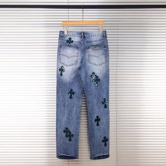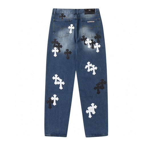 JEANS EN DENIM À ÉCUSSONS CROIX NOIRS CHROMÉS