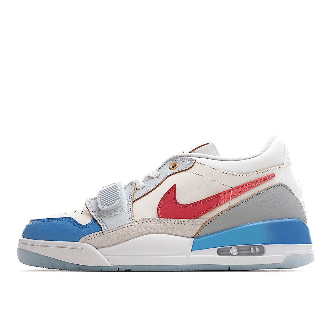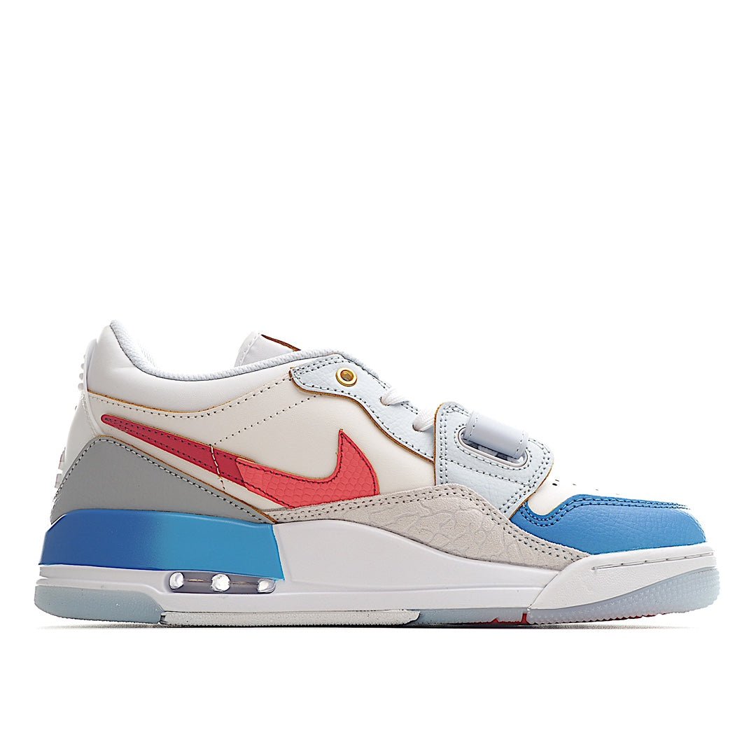 L'empeigne est confectionnée en cuir blanc de première qualité, conférant à la sneaker une allure nette et épurée. Le garde-boue emblématique en cuir verni est également blanc, créant une silhouette élégante et élancée. Ce qui rend cette paire unique, ce sont les touches de bleu et de rouge éclatantes qui dynamisent la chaussure. Les reflets bleus sur le logo Jumpman et la doublure intérieure offrent un contraste saisissant, tandis que les détails rouge vif sur la semelle extérieure et la languette au talon ajoutent une note de couleur audacieuse, pour une finition à la fois équilibrée et captivante.