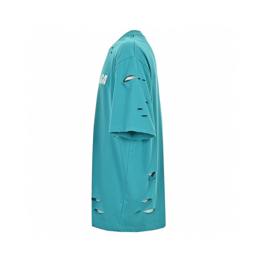 Ce t-shirt Balenciaga arbore un motif turquoise éclatant et des détails volontairement usés, lui conférant un style tendance et décontracté. Le logo Balenciaga, audacieux, est fièrement affiché sur la poitrine. Confectionné dans des matières de haute qualité, ce t-shirt allie confort et durabilité. Parfait pour un look casual, il apporte une touche stylée et originale à toutes vos tenues.