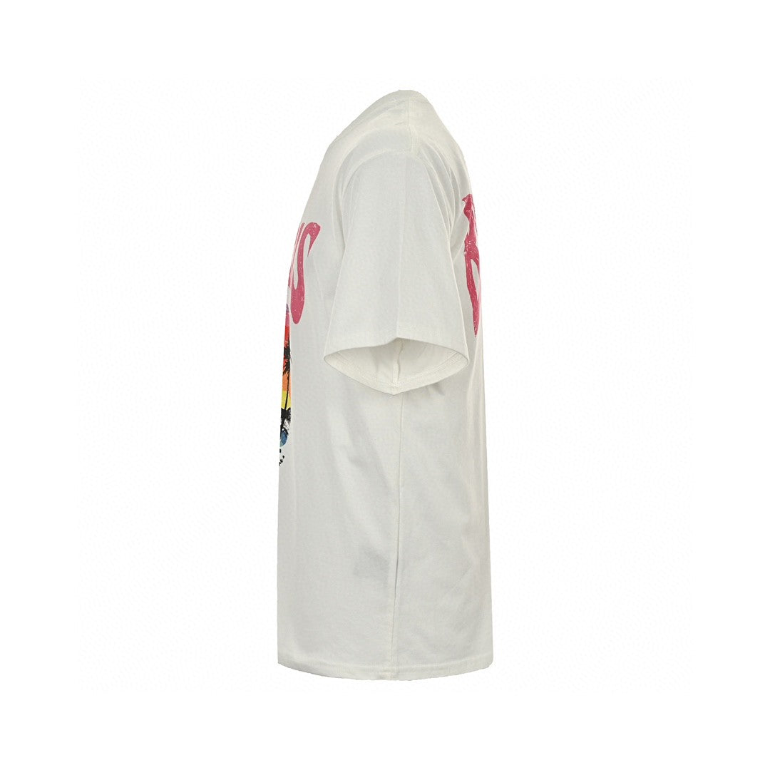 Ce t-shirt Balenciaga arbore un motif vibrant et coloré, inspiré de Paris, sur le devant. L'illustration représente un coucher de soleil avec la Tour Eiffel, des palmiers et une palette de couleurs dynamiques. Confectionné dans des matières de haute qualité, ce t-shirt allie confort et durabilité. Parfait pour un style décontracté, il apporte une touche artistique et cosmopolite à toutes vos tenues.