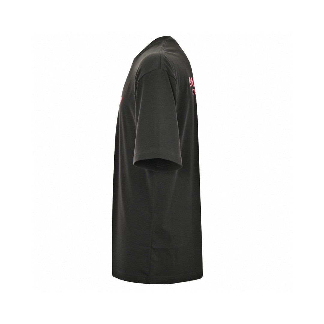 Ce t-shirt Balenciaga arbore un design noir minimaliste. Le logo Balenciaga, d'un rose vif, est apposé sur le devant, accompagné de l'inscription « Couture Paris 8 ». Ses lignes épurées et son esthétique simple en font le vêtement idéal pour un look moderne et décontracté. Parfait pour apporter une touche contemporaine à vos tenues du quotidien.