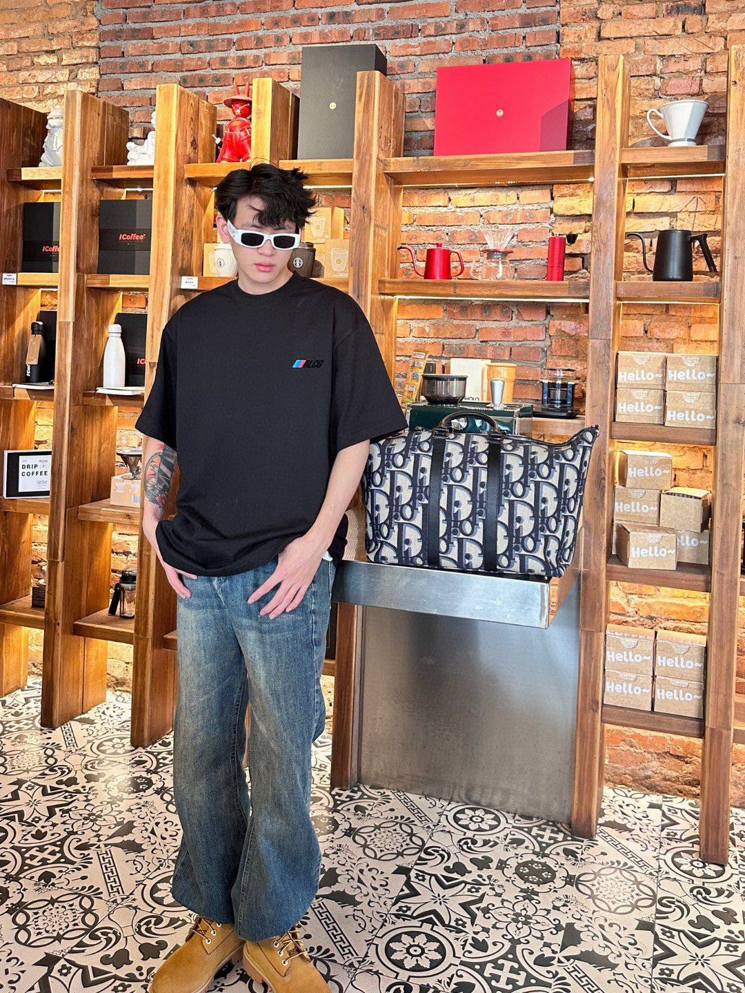 Ce t-shirt Balenciaga arbore un design noir épuré. Le devant est orné d'un petit motif multicolore rouge, bleu et blanc, ainsi que du logo Balenciaga en noir. Son esthétique minimaliste en fait le vêtement idéal pour un look moderne et décontracté. Parfait pour apporter une touche contemporaine à vos tenues du quotidien.
