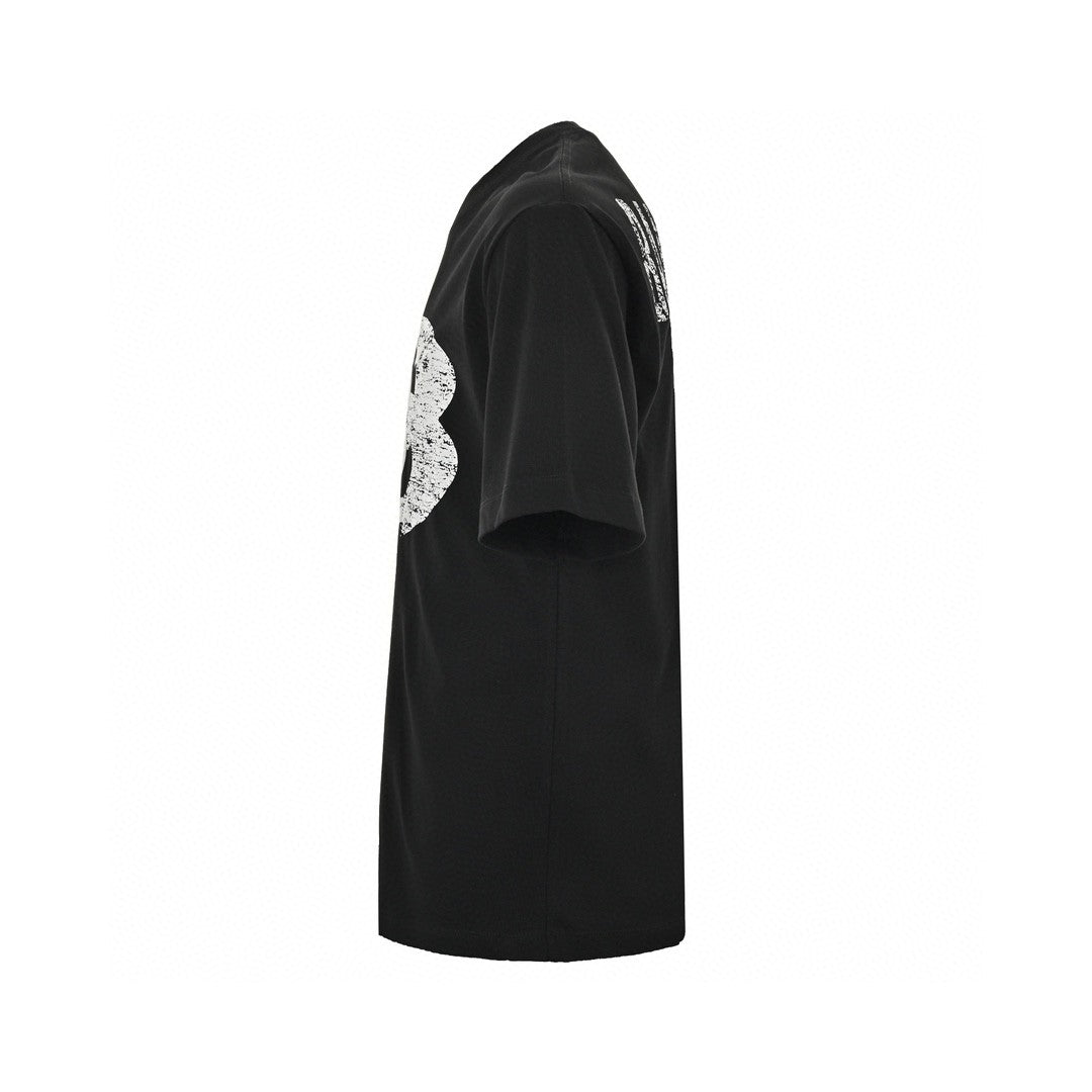 Ce t-shirt Balenciaga arbore un design audacieux avec un logo graphique blanc à l'effet vieilli sur le devant. Ce logo imposant et accrocheur apporte une touche vintage au tissu noir, faisant de ce t-shirt une pièce phare de toute garde-robe décontractée. Idéal pour celles et ceux qui apprécient les looks originaux et audacieux.
