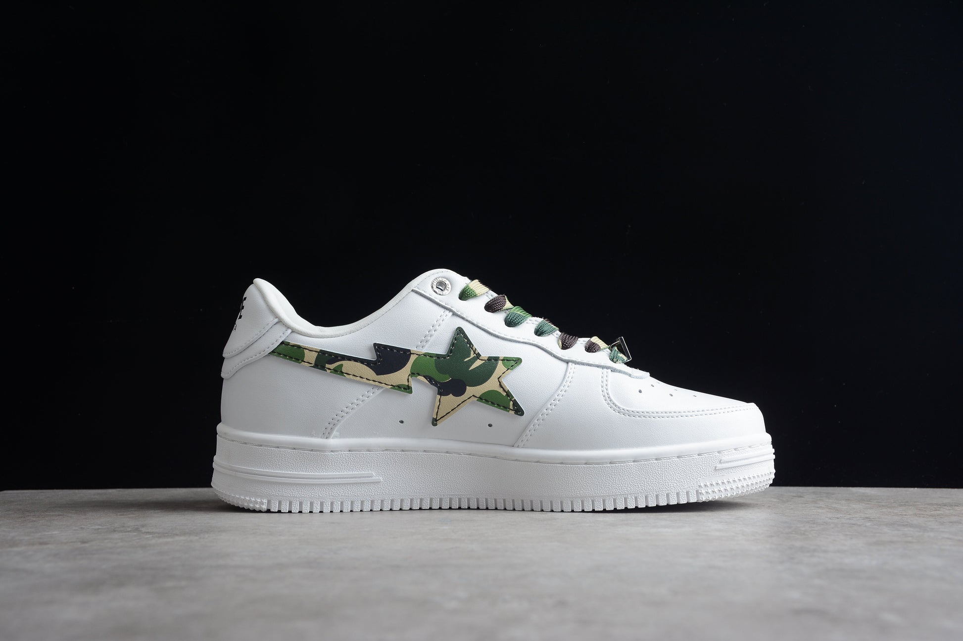 - **Coloris :** La base blanche éclatante est complétée par le logo étoile BAPE à motif camouflage, créant un contraste unique et accrocheur.