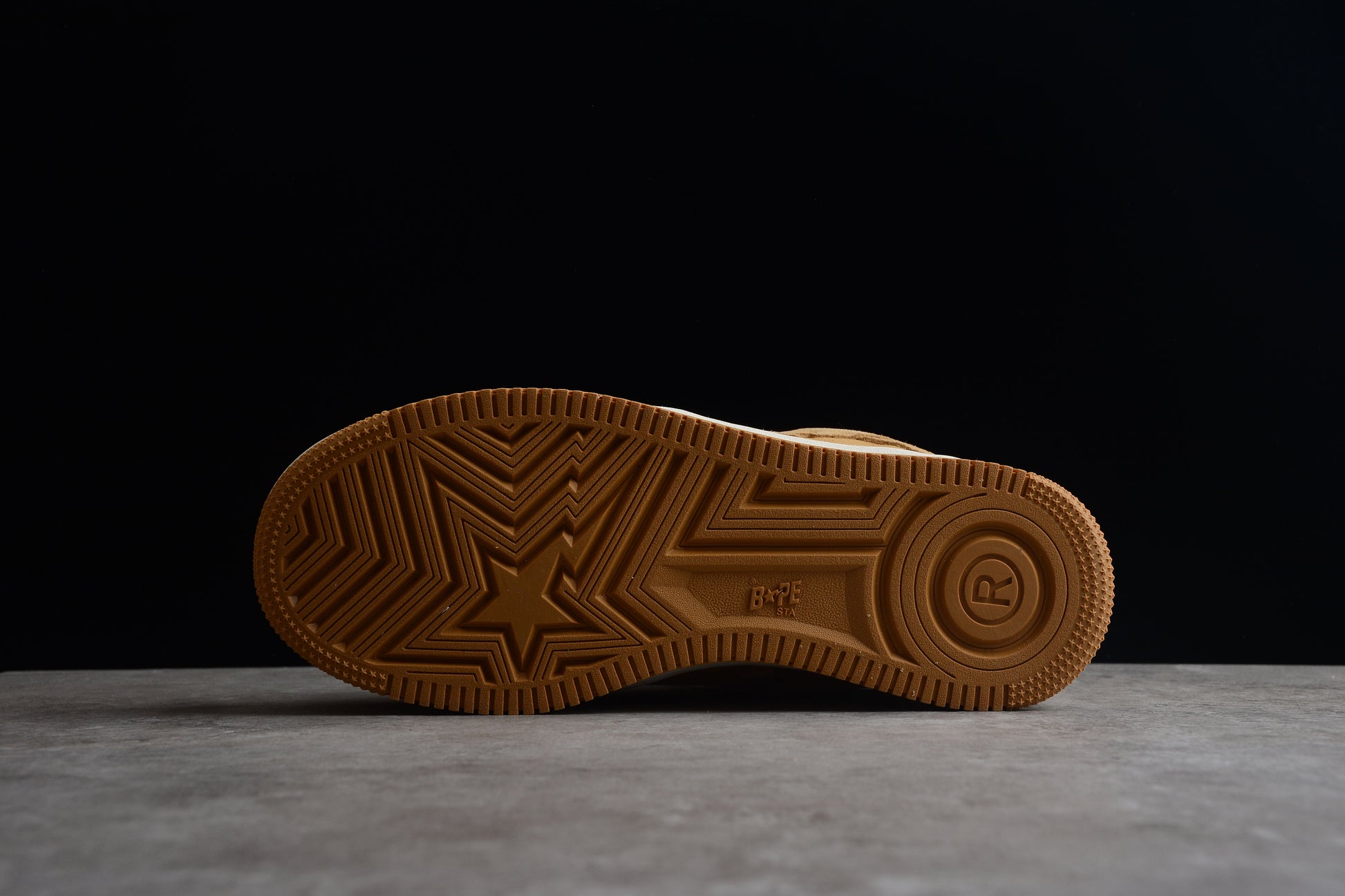 La semelle extérieure en caoutchouc des baskets basses BAPE STA en daim beige garantit durabilité et adhérence optimale. La semelle texturée assure une stabilité parfaite sur toutes les surfaces, tandis que la semelle intermédiaire amortissante offre un excellent amorti, réduisant ainsi la fatigue de vos pieds. Ces caractéristiques rendent ces baskets à la fois élégantes et pratiques pour un usage quotidien.