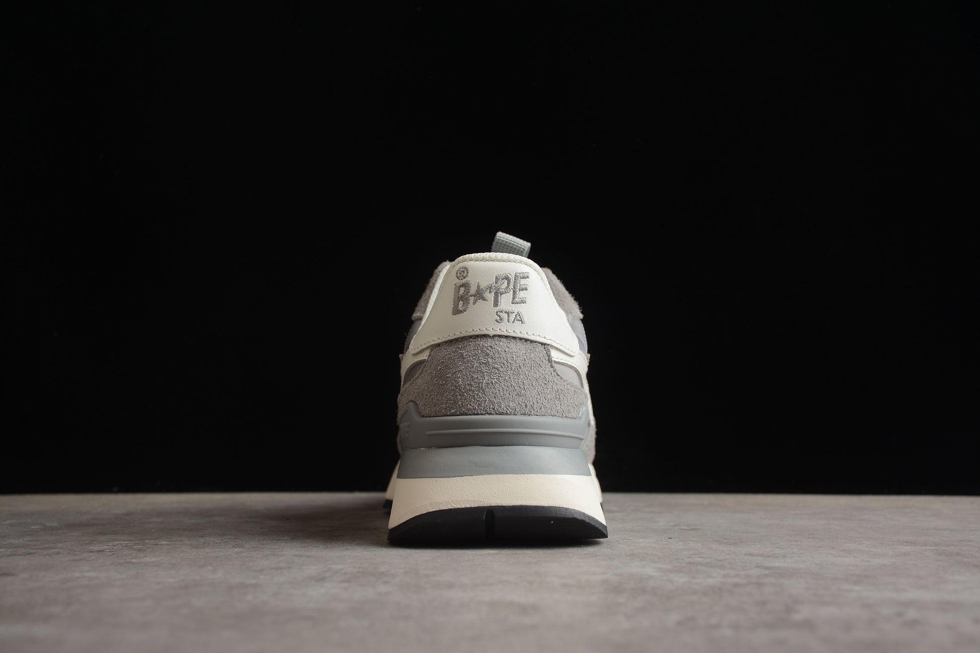 Confectionnée à partir de matériaux haut de gamme, l'empeigne associe mesh gris et empiècements en daim, offrant à la fois durabilité et respirabilité. Le subtil contraste entre les différentes textures apporte de la profondeur au design, tandis que le logo BAPE blanc en forme d'étoile sur les côtés lui confère une allure à la fois affirmée et discrète. Le coloris neutre gris et blanc permet à ces sneakers de s'accorder facilement avec de nombreuses tenues.
