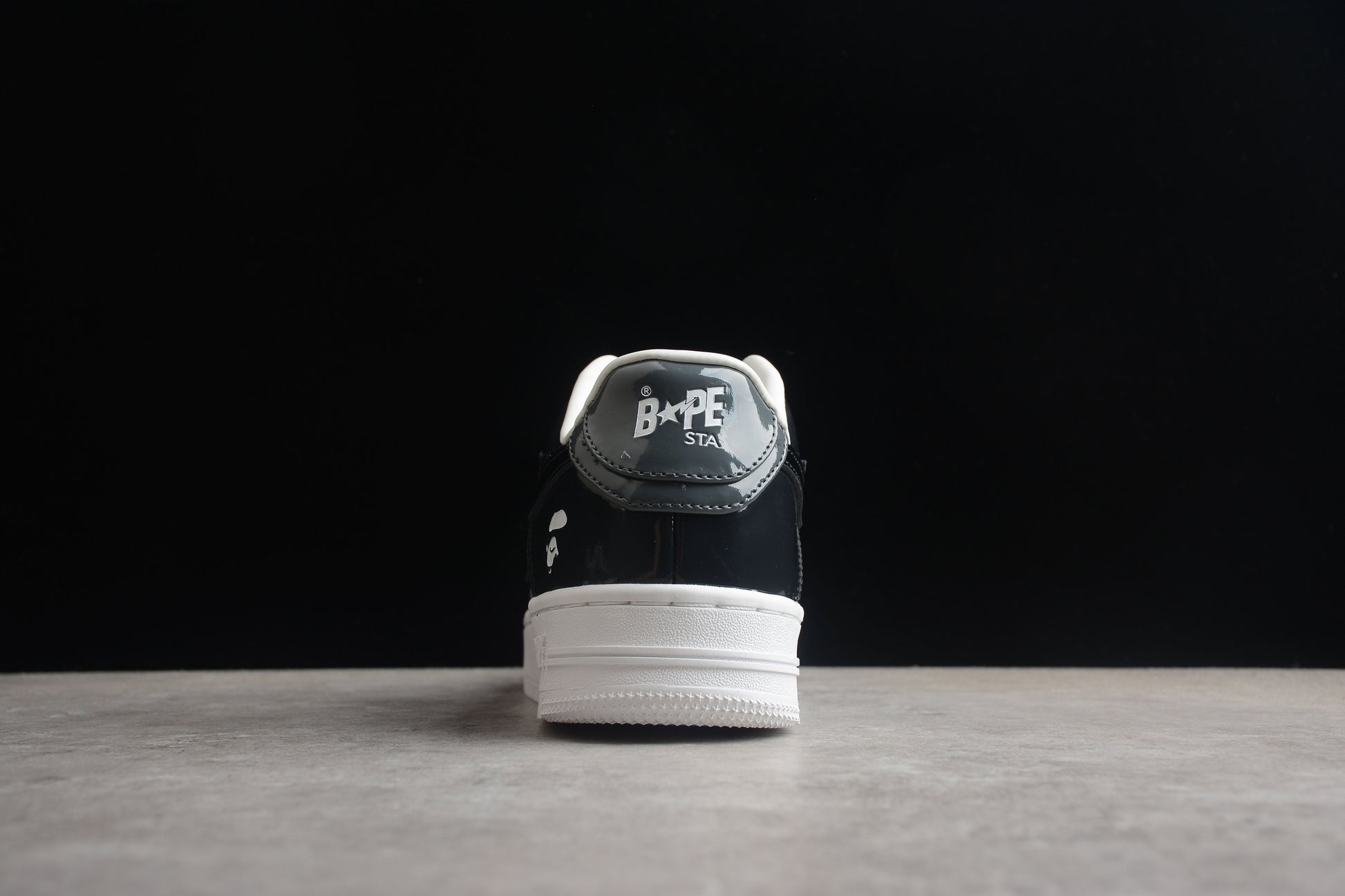 L'empeigne de ces sneakers est confectionnée en cuir verni noir de haute qualité, offrant un éclat saisissant et réfléchissant. Ce style sophistiqué est rehaussé par le logo étoile emblématique de BAPE sur le panneau latéral, également noir, créant ainsi un design épuré et élégant. Le logo iconique de la tête de singe de BAPE est discrètement apposé sur le talon, contribuant à l'identité visuelle unique de la chaussure.
