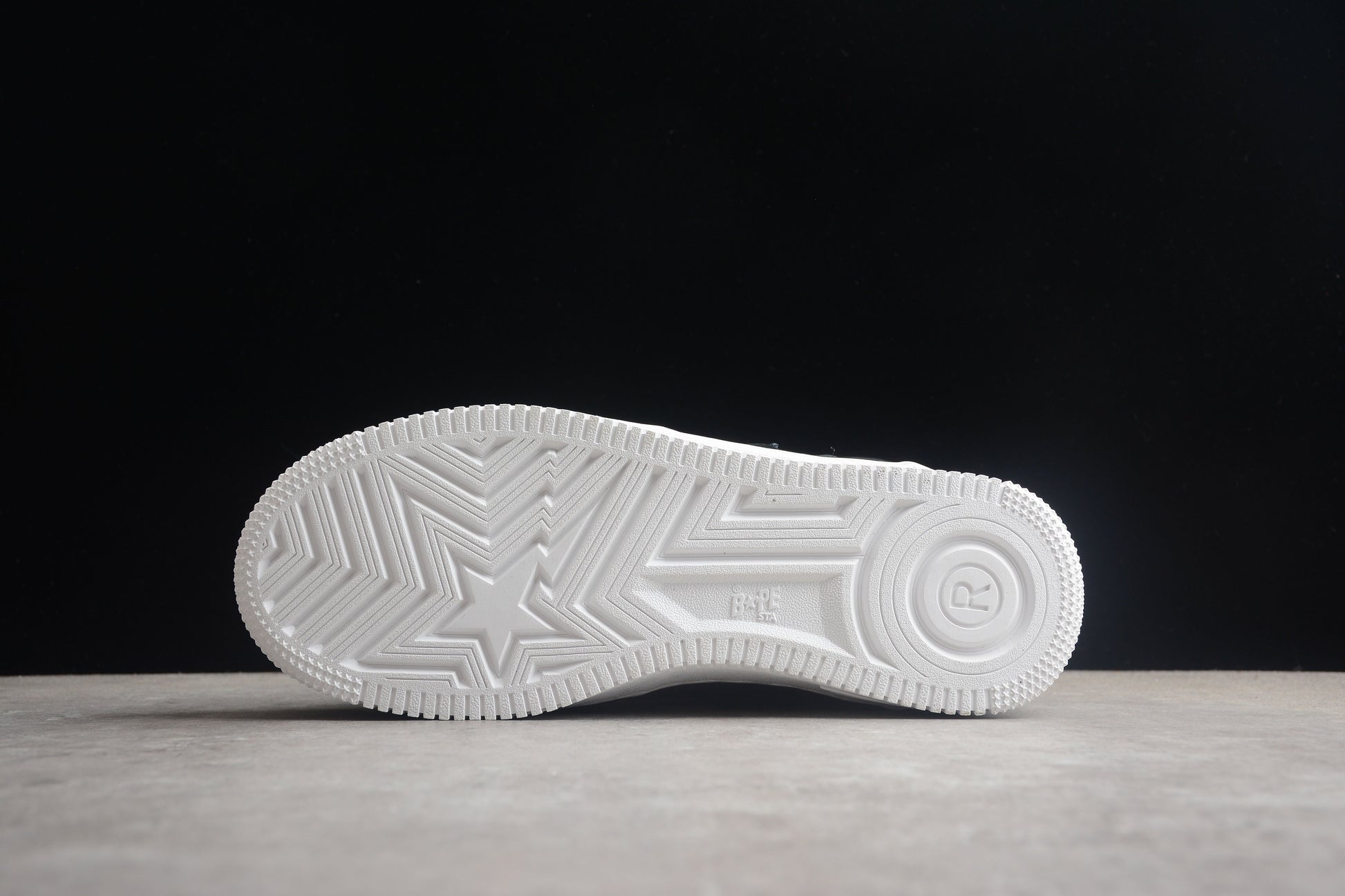 La semelle extérieure en caoutchouc robuste, d'un blanc éclatant, contraste magnifiquement avec l'empeigne noire et garantit une durabilité et une adhérence optimales sur toutes les surfaces. Le logo BAPE est embossé sur la semelle, ajoutant une touche d'authenticité et de fierté pour la marque.