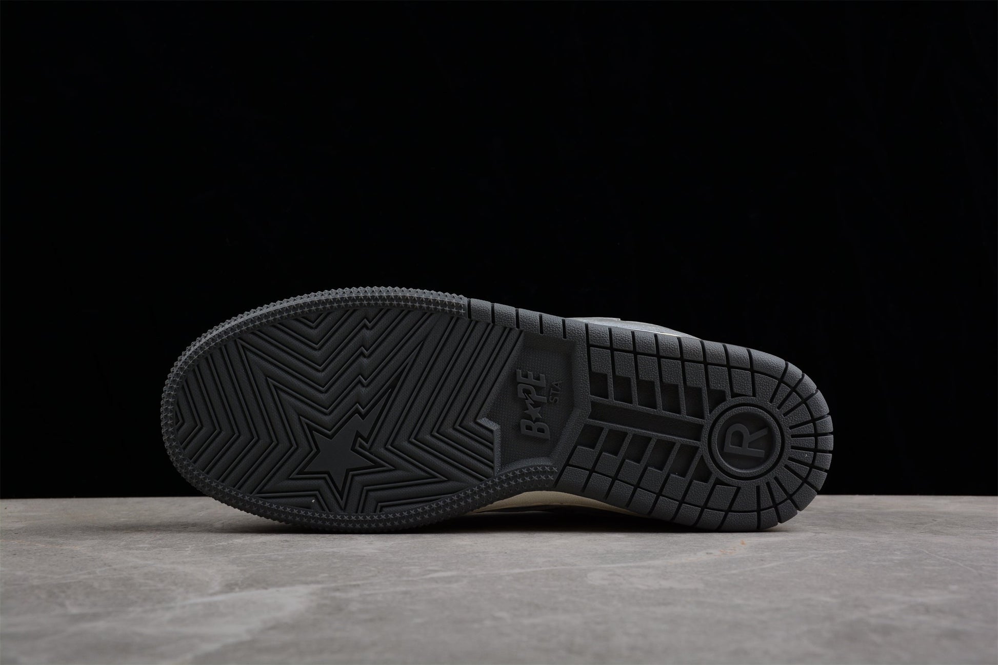 La semelle épaisse en caoutchouc, de couleur crème classique, complète harmonieusement le design tout en assurant une excellente adhérence et une grande durabilité. Le logo BAPE discret sur la semelle renforce encore le caractère unique de la sneaker.