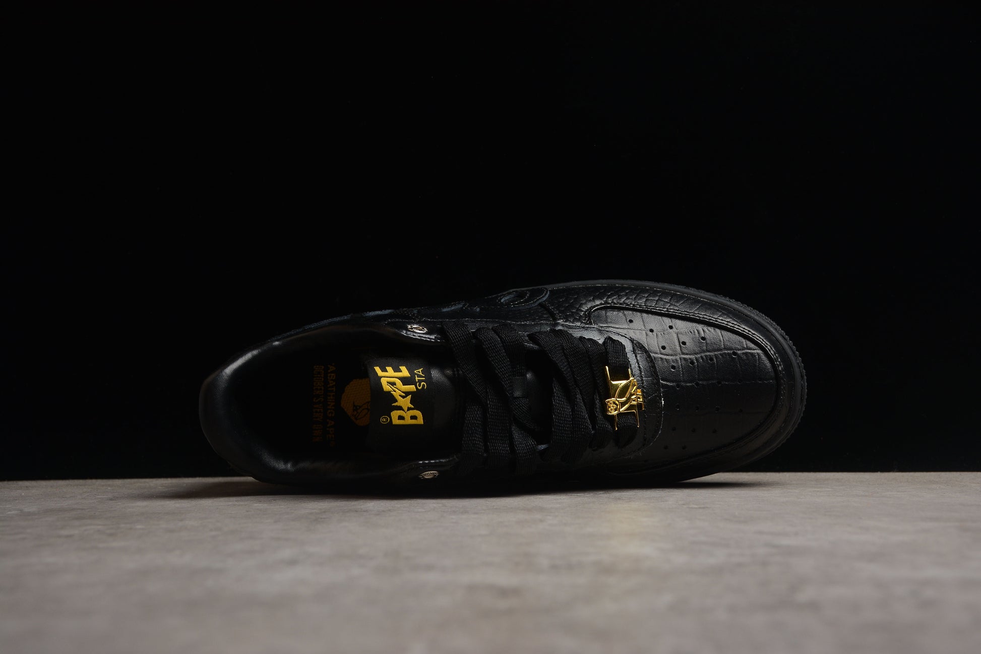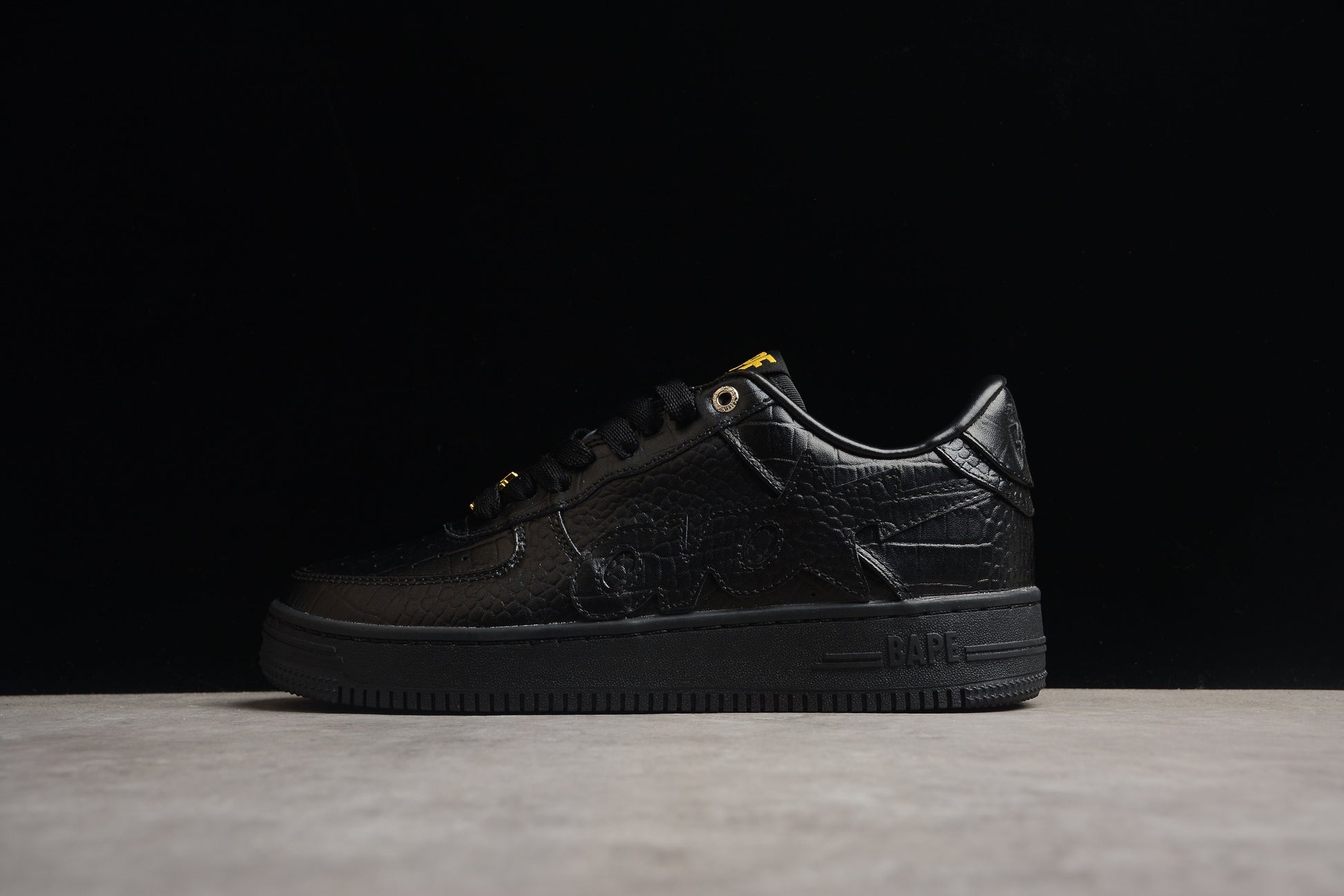 Ces sneakers arborent une élégante empeigne en cuir noir à la texture crocodile distinctive, pour un look à la fois haut de gamme et audacieux. Le logo iconique BAPE STA est subtilement intégré aux empiècements latéraux, sublimant le design sans l'éclipser. Le coloris noir est rehaussé de détails dorés sur les œillets et la languette, apportant une touche de luxe et de contraste.