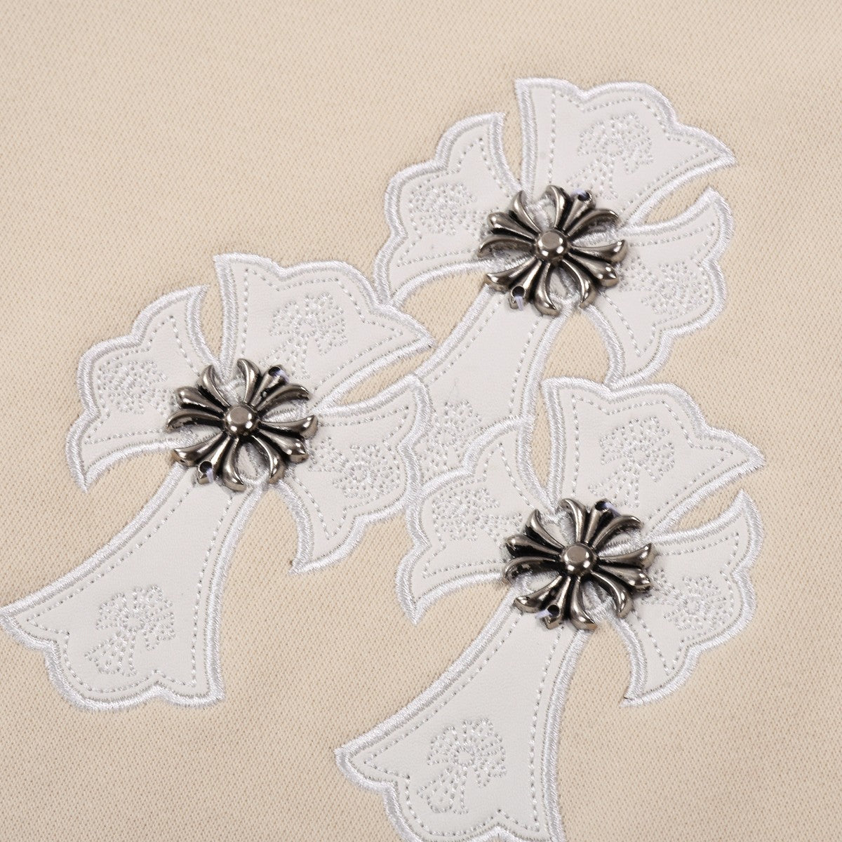 LE STREETWEAR DE LUXE À L'ESPRIT INTEMPOREL. Le sweat-shirt Chrome Hearts à écusson croix blanche allie un savoir-faire d'exception à des détails gothiques audacieux . Ses écussons croix blancs cousus main contrastent avec la douceur du tissu beige. Une pièce qui incarne un style décontracté et une attitude rebelle affirmée .