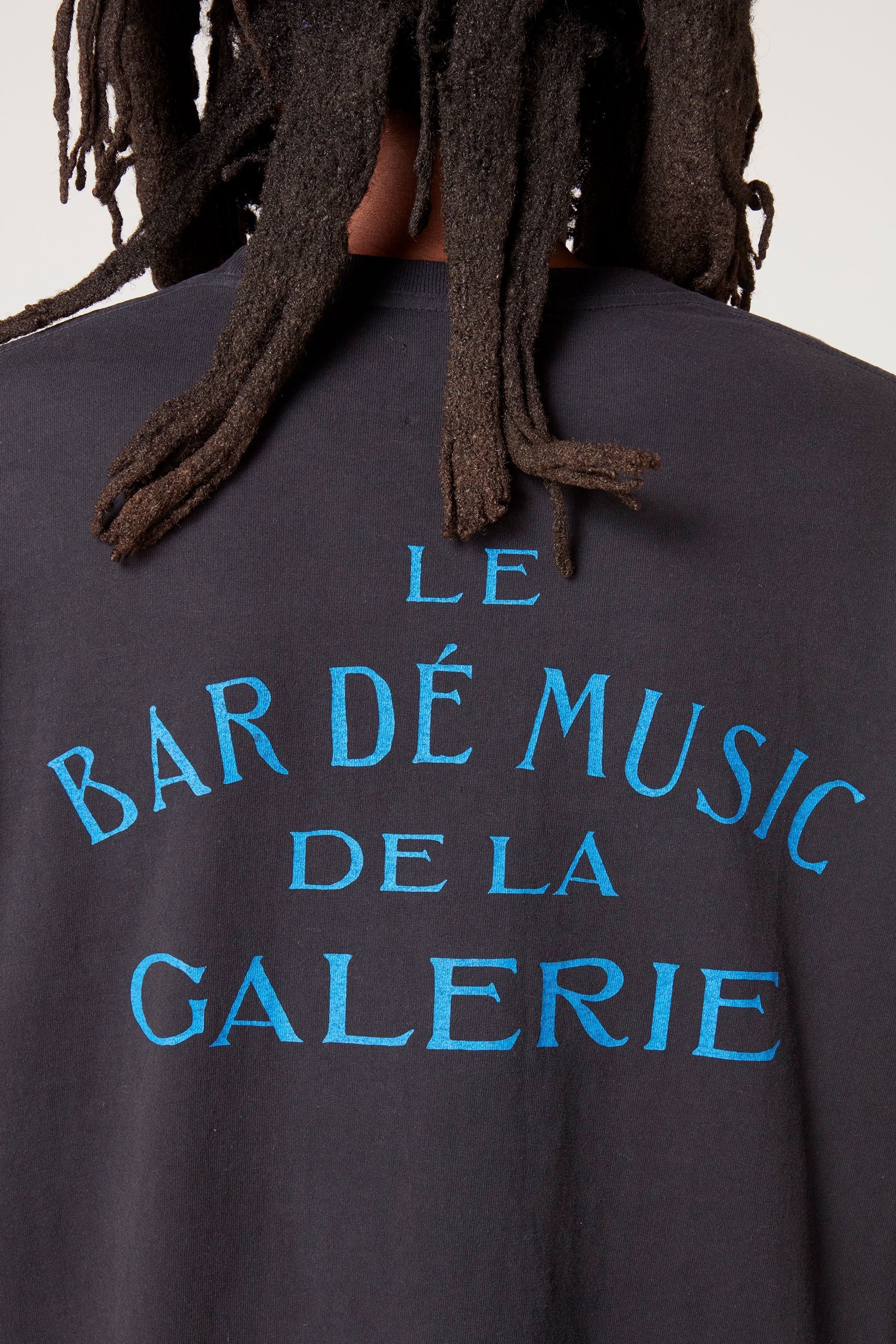 Ce t-shirt se distingue par son imprimé graphique saisissant au dos et sur les manches. La phrase « Le Bar Dé Music De La Galerie », imprimée en bleu vif au dos, crée un contraste visuel captivant avec le tissu noir. Les manches sont également ornées d'un texte assorti, ajoutant une touche de style et de raffinement supplémentaire.