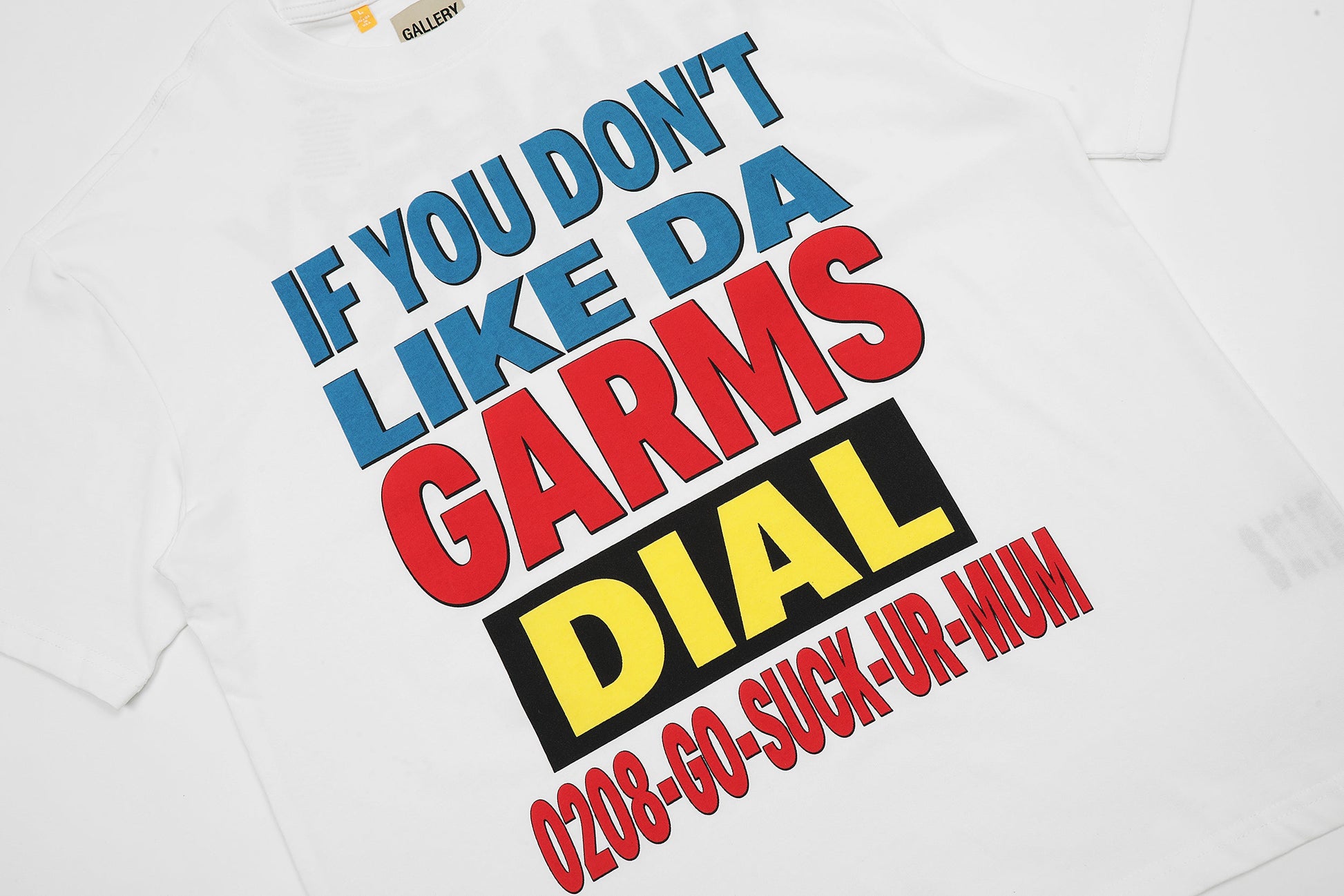 Découvrez le t-shirt « If You Don't Like Da Garms Dial » de Gallery Dept., une pièce audacieuse et ludique qui complétera à merveille votre collection streetwear. Ce t-shirt blanc, au design graphique saisissant, ne manquera pas de faire sensation où que vous alliez.