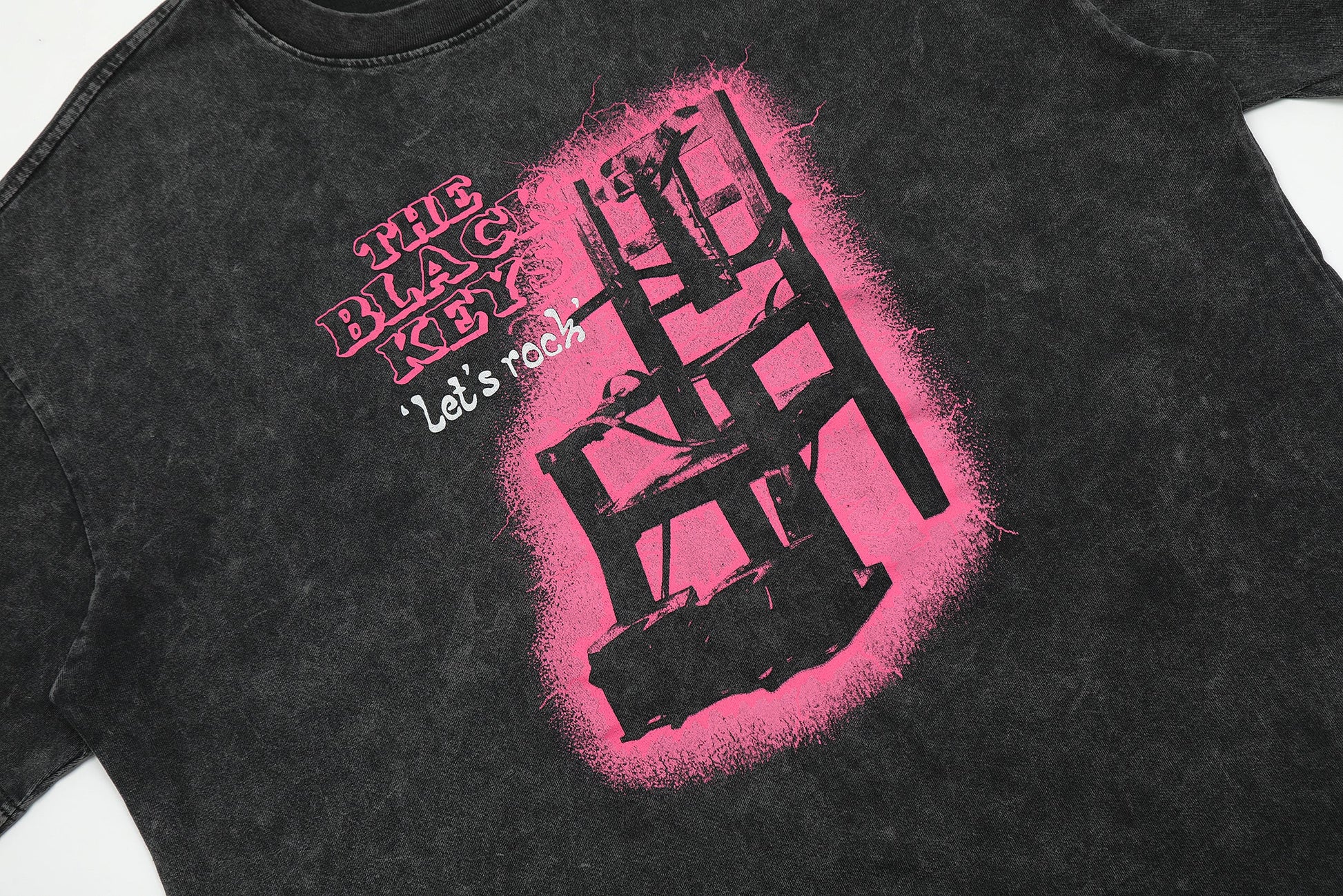 Le devant du t-shirt arbore un motif saisissant d'amplificateurs empilés sur un fond rose vif, orné des inscriptions « THE BLACK KEY » et « Let's rock » dans une police de style graffiti à l'aspect vieilli. Ce design accrocheur capture l'esprit rebelle du rock 'n' roll et est idéal pour celles et ceux qui veulent affirmer leur style.