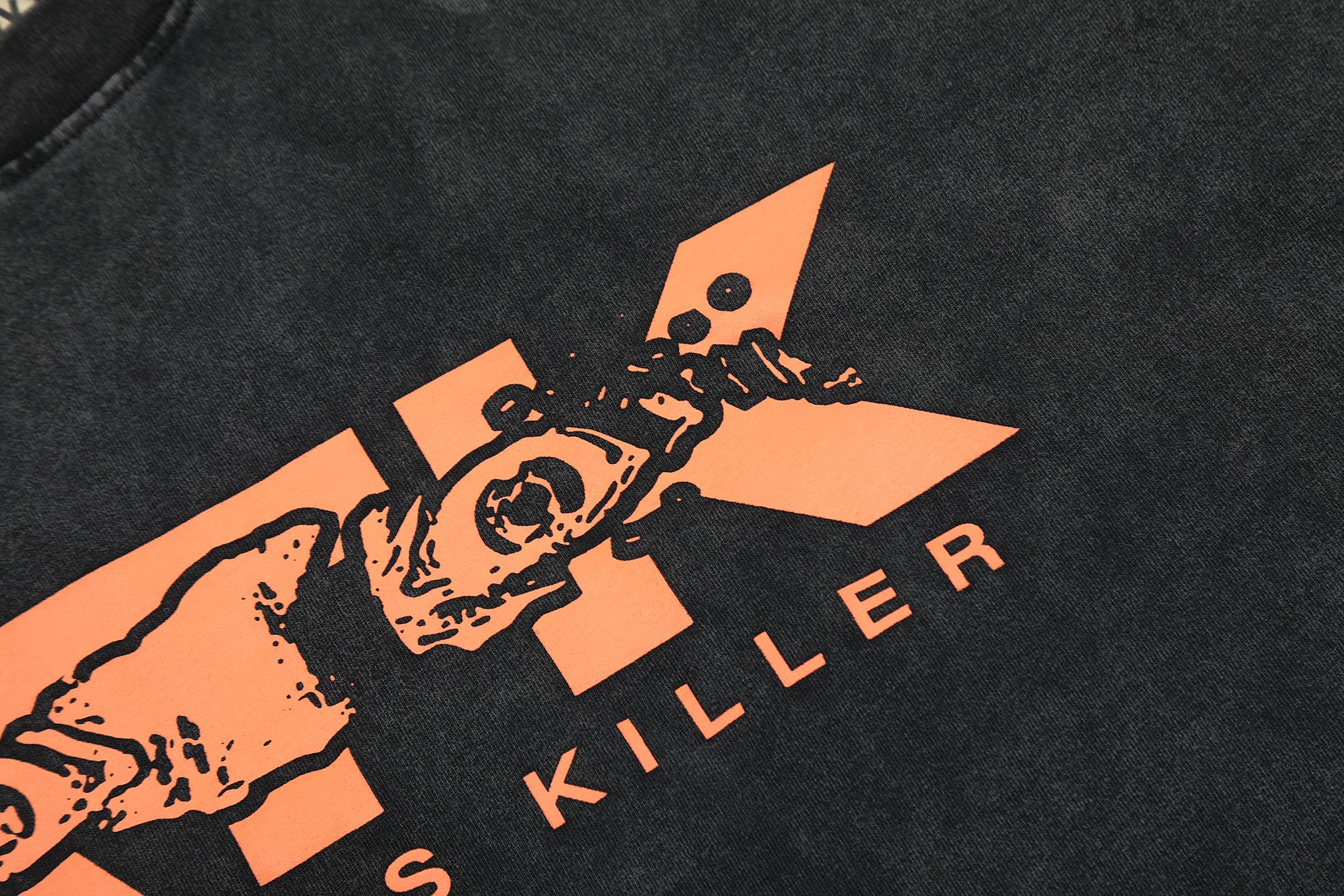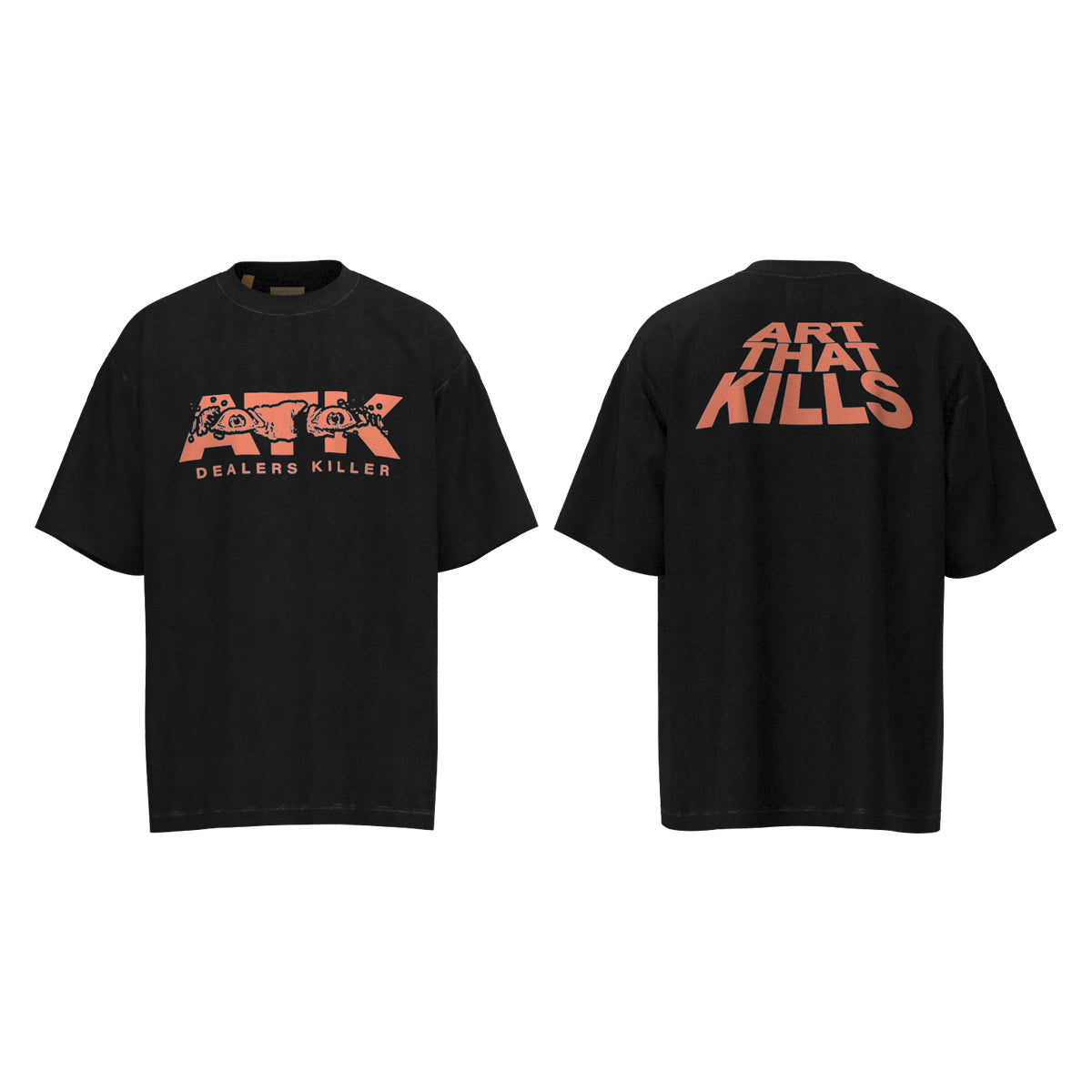 Le t-shirt « Gallery Dept. Art That Kills Dealers Killer » est une pièce forte et audacieuse. Confectionné en coton de haute qualité, ce t-shirt noir offre une coupe décontractée pour un confort optimal. Le motif avant arbore l'inscription « ATK Dealers Killer » en orange vif, rehaussée de graphismes stylisés et complexes qui apportent une touche unique à l'ensemble.