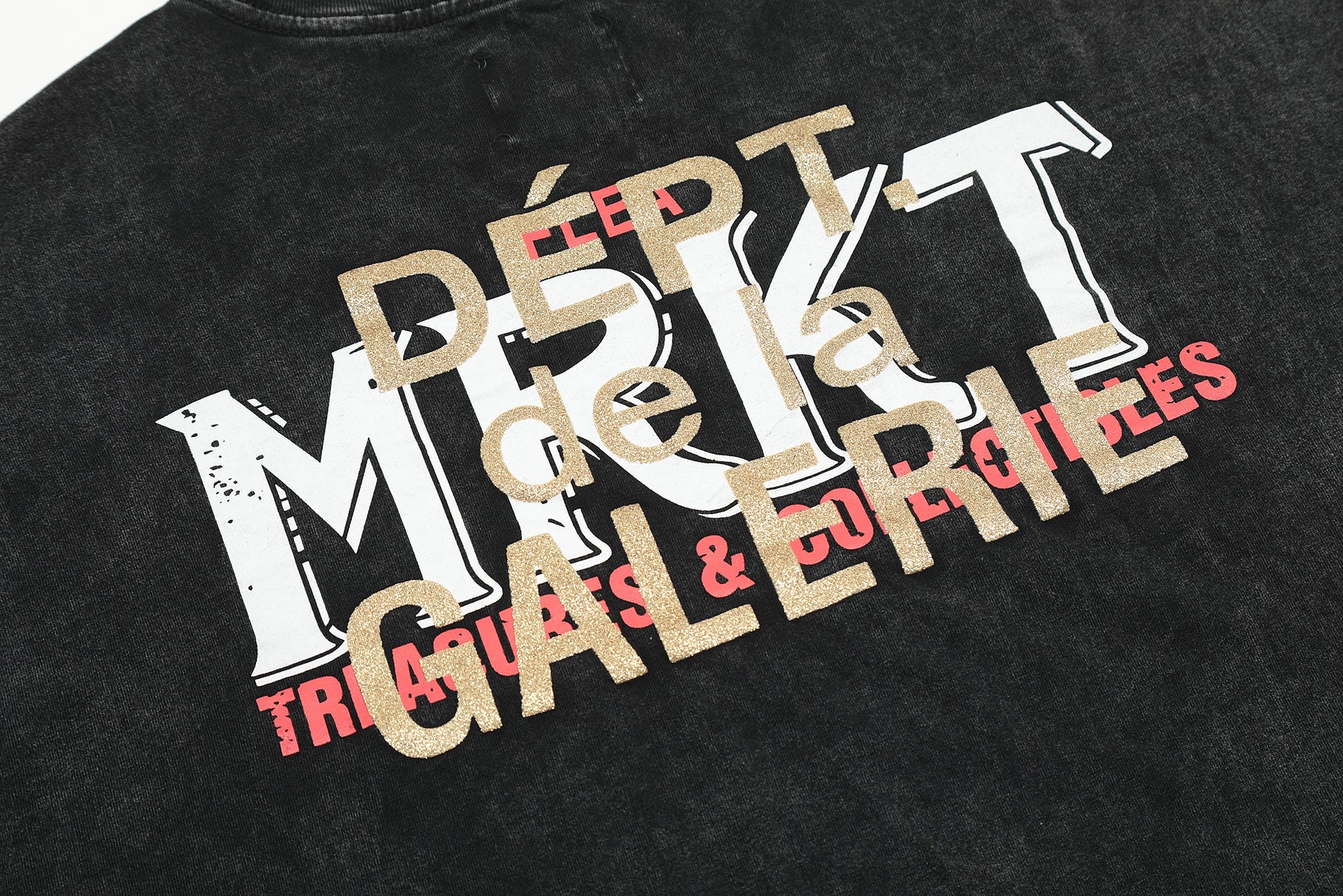 Au dos, le t-shirt reprend le thème avec un graphisme saisissant : « DEPT MRKT GALERIE », une stylisation mêlant caractères gras et effet vieilli. Le texte, décliné en plusieurs couleurs, apporte une touche dynamique et artistique à l’ensemble. Ce mariage unique de typographie et de couleurs confère au t-shirt un style à la fois vintage et contemporain, reflétant l’approche novatrice de la marque en matière de mode.