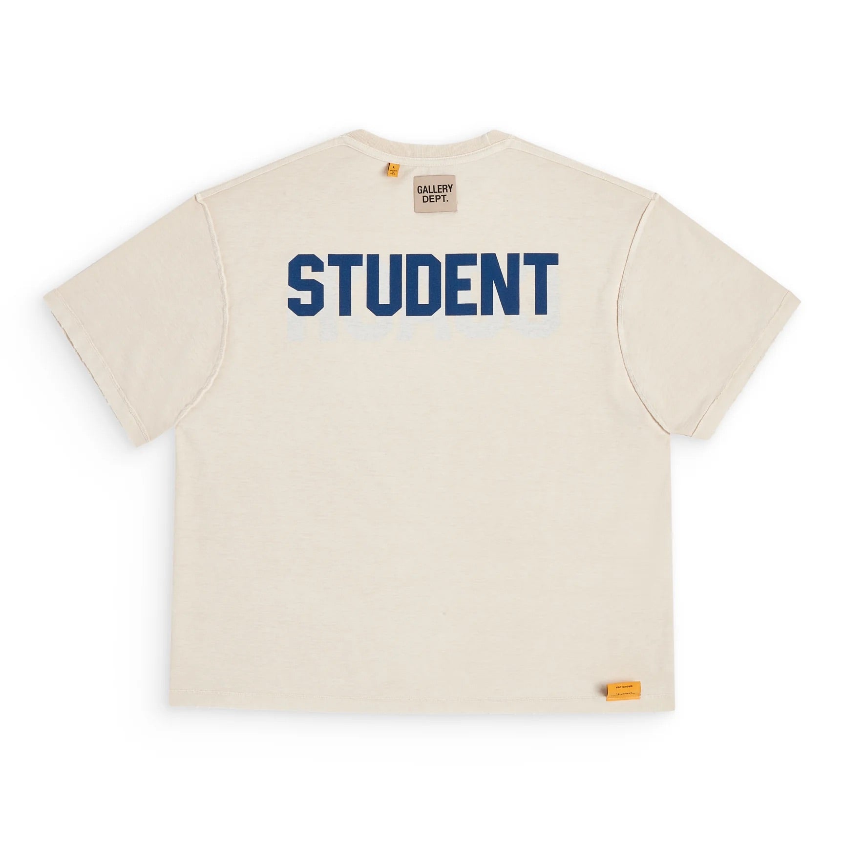 Ce t-shirt se distingue par son imprimé « STUDENT » en lettres noires audacieuses au dos. Pièce forte, il est idéal pour celles et ceux qui souhaitent affirmer leur individualité et leur style. À l'avant, le logo classique de Gallery Dept. est discrètement apposé au niveau de l'encolure, apportant une touche de reconnaissance de la marque sans éclipser le design principal.