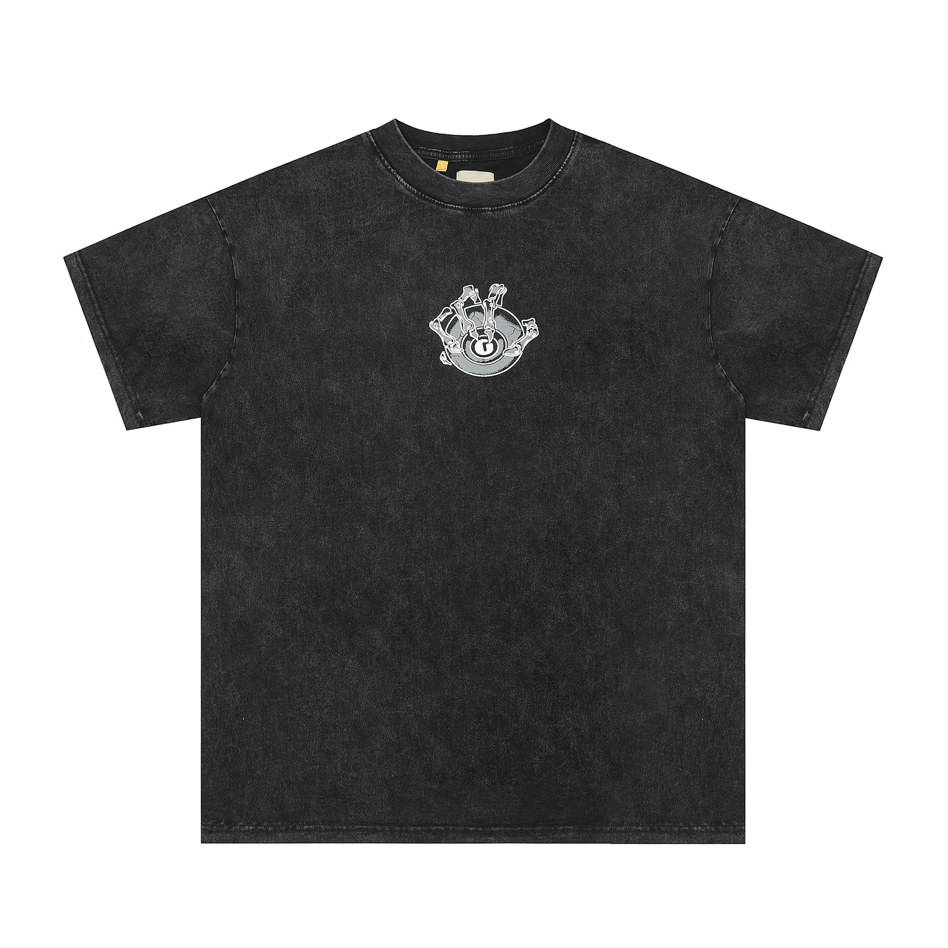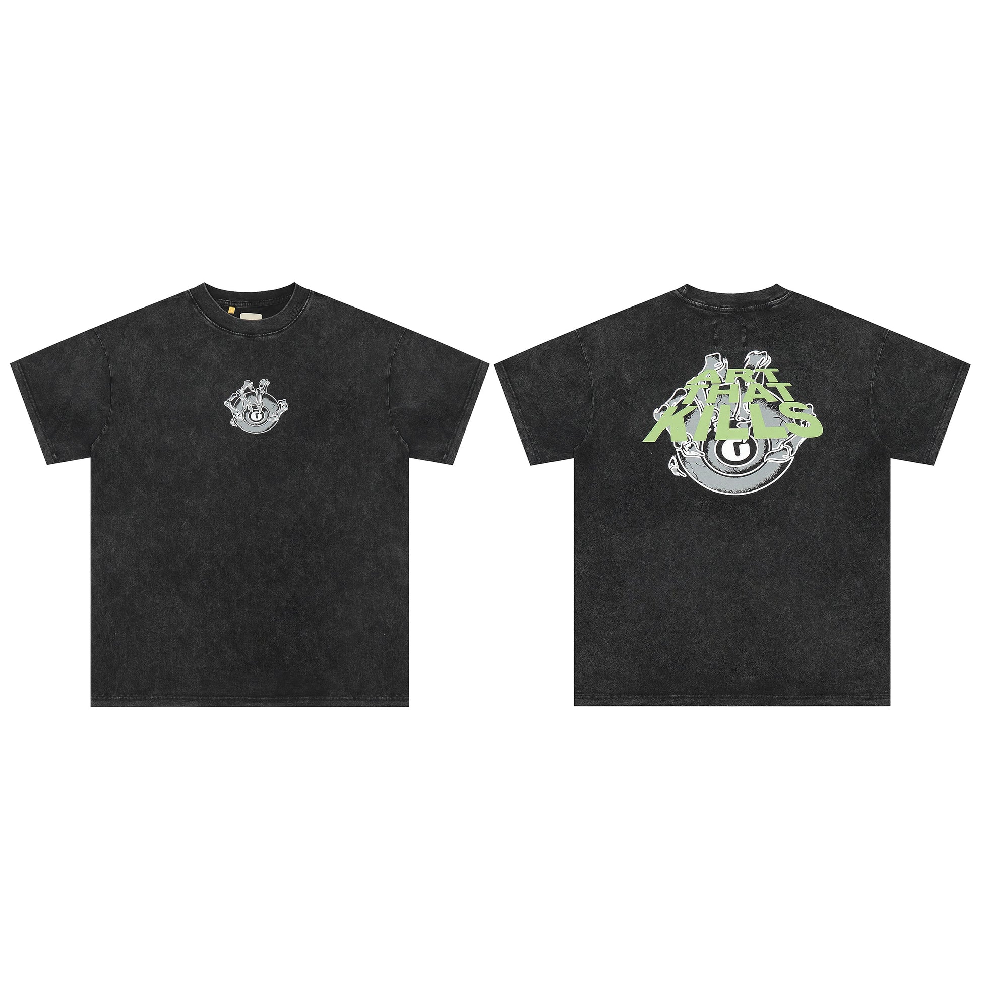 Le devant du t-shirt est orné d'un petit emblème détaillé sur la poitrine gauche, signature de Gallery Dept. Au dos, un grand motif saisissant représente un appareil photo rétro, sur lequel est superposée la phrase « Art Kills » en vert fluo éclatant. Ce design percutant capture l'esprit rebelle et créatif de la marque et affirme avec force l'impact de l'art.