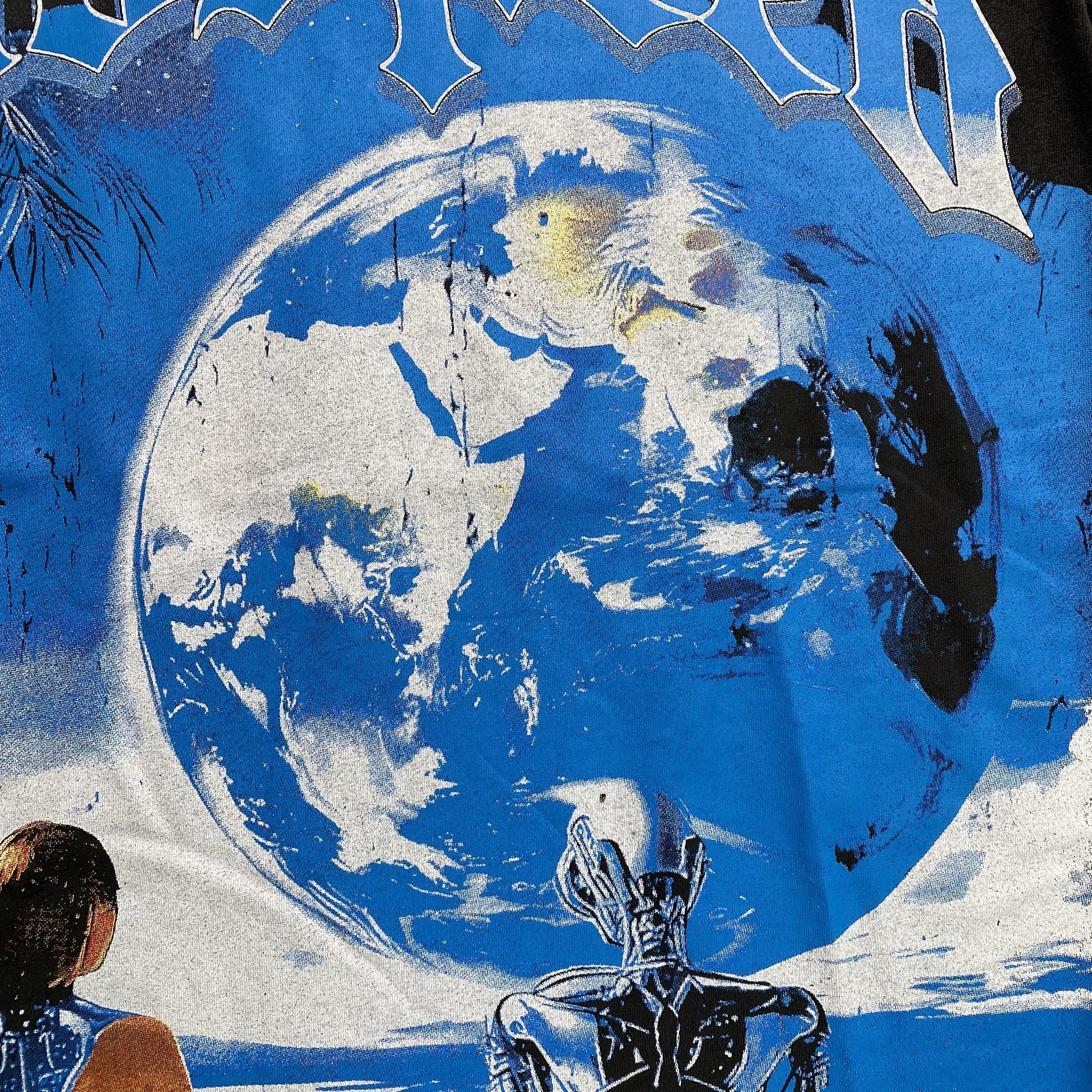 Confectionné en coton épais de qualité supérieure , ce t-shirt offre une sensation de douceur et de structure, ainsi qu'une coupe oversize , pour un confort et une durabilité exceptionnels . Son fond noir délavé lui confère un aspect vintage et usé , renforçant l' esthétique brute et dystopique du design . L' imprimé graphique audacieux apporte profondeur et originalité , tandis que le col côtelé assure une excellente tenue et une grande résistance .