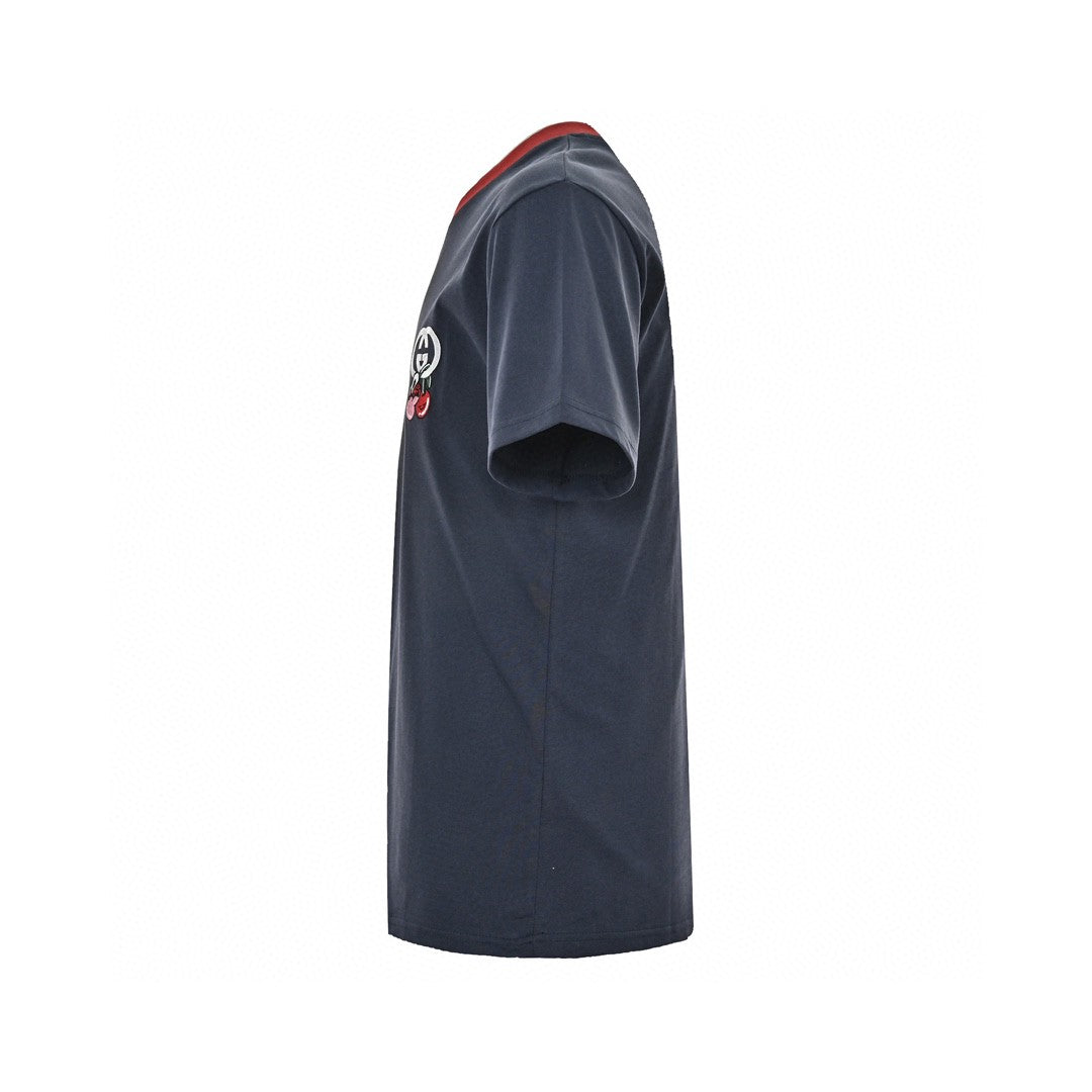 Ce t-shirt Gucci bleu marine arbore un petit motif de cerises ludique entrelacé avec le logo iconique de la marque sur la poitrine. Son col rouge contrastant apporte une touche d'élégance et de fantaisie à vos tenues décontractées.