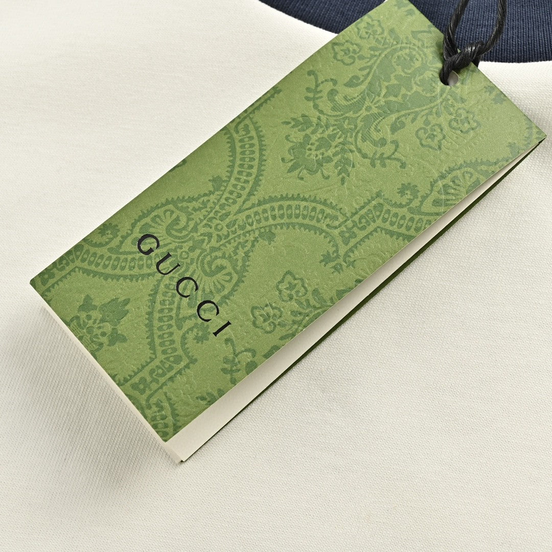 Ce t-shirt Gucci arbore un petit motif de cerises ludique entrelacé avec le logo iconique de la marque sur la poitrine. Le design se détache sur un fond blanc avec un col noir contrastant, apportant une touche d'originalité et d'élégance à vos tenues décontractées.