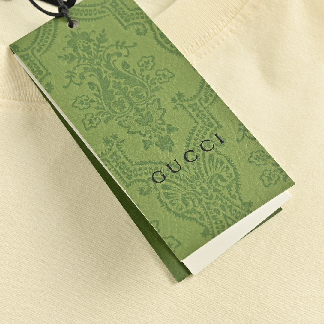 Ce t-shirt Gucci arbore un design classique couleur crème orné du logo GG entrelacé rouge et vert sur la poitrine. Confectionné en coton de haute qualité, il allie confort et style iconique. Parfait pour un look à la fois élégant et décontracté, ce t-shirt est un incontournable de toute garde-robe.