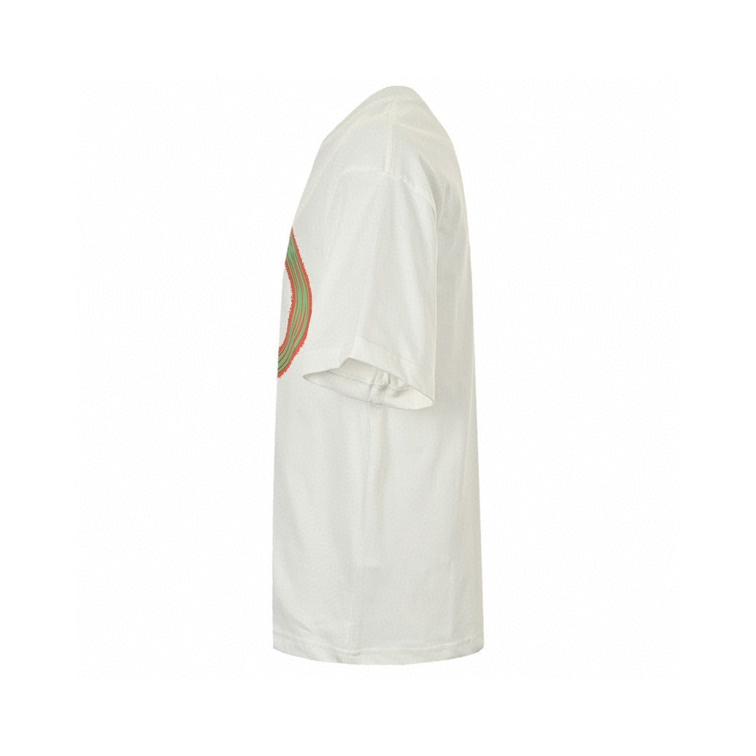 Ce t-shirt Gucci arbore un grand logo G multicolore entrelacé sur le devant. Son design éclatant apporte une touche audacieuse et contemporaine au fond blanc classique, en faisant une pièce incontournable de toute garde-robe à la pointe de la mode.