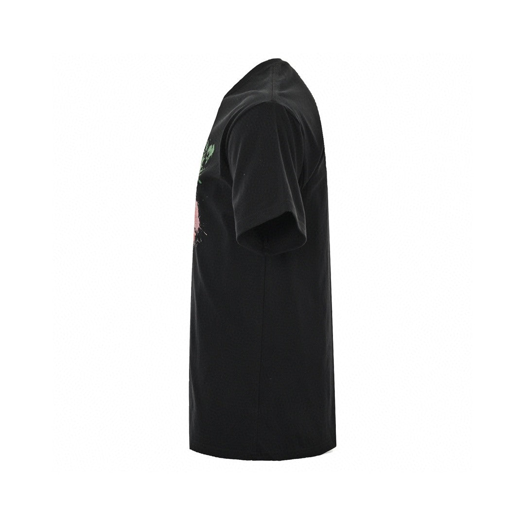 Ce t-shirt noir Gucci arbore un logo à effet éclaboussures dynamique. Le double G emblématique de la marque est mis en valeur au centre, rehaussé d'éclaboussures de peinture vertes et rouges, pour un style moderne et artistique. Confectionné dans des matières de haute qualité, ce t-shirt allie confort et style. Sa coupe décontractée et son col rond classique en font une pièce polyvalente, idéale pour apporter une touche d'élégance à vos tenues casual.