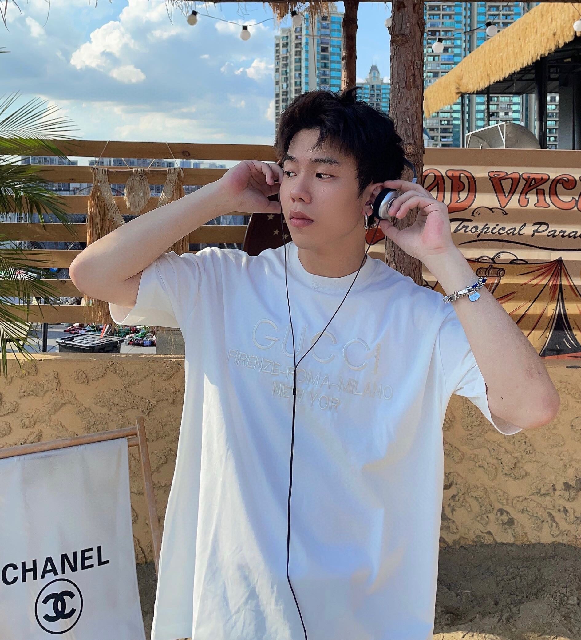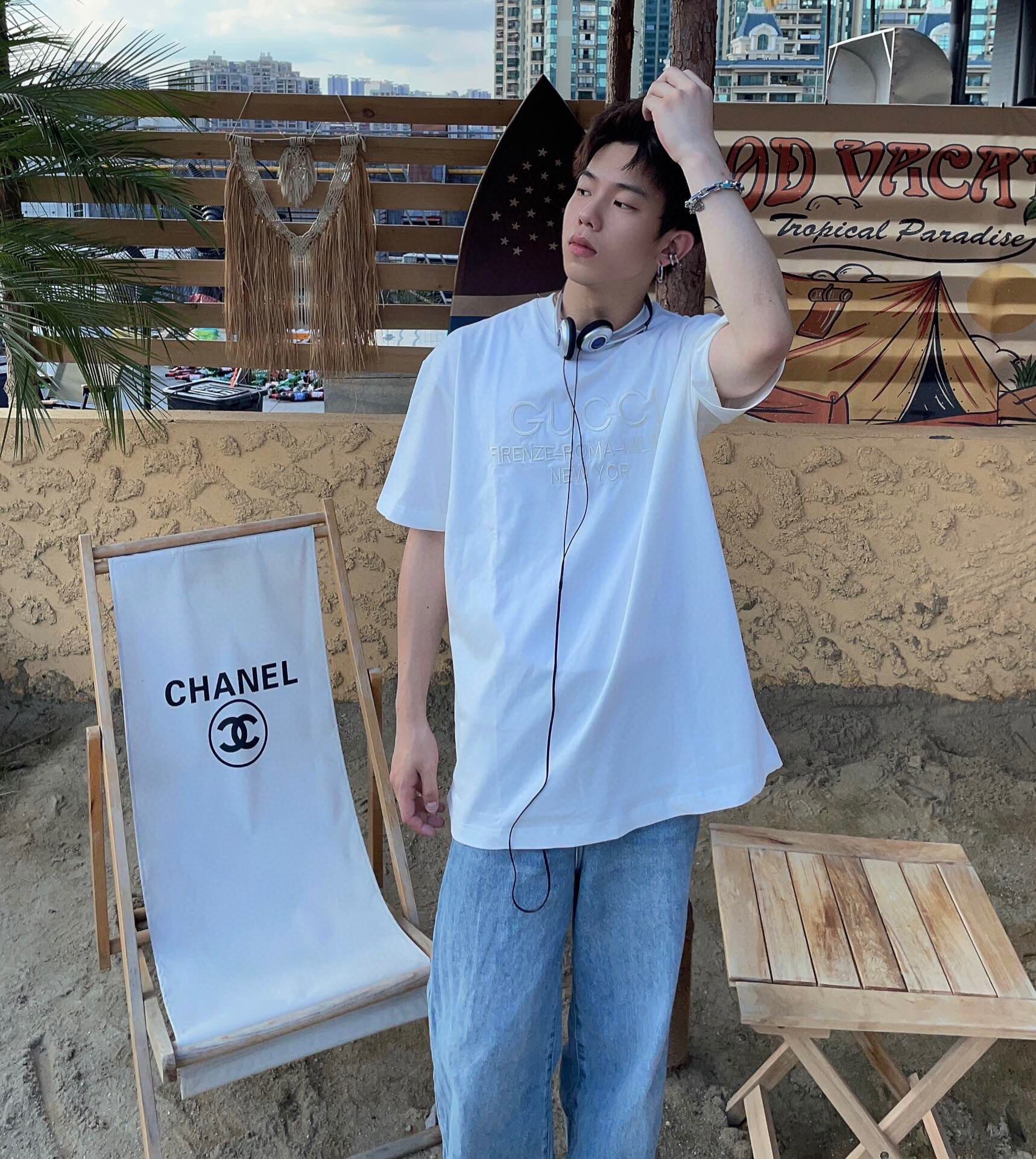 T-shirt blanc orné d'une broderie discrète affichant les noms des villes « FIRENZE-ROMA-MILANO-NEW YORK » sous le logo Gucci. Confectionné en coton premium pour un confort optimal. Idéal pour apporter une touche de sophistication à une tenue décontractée.