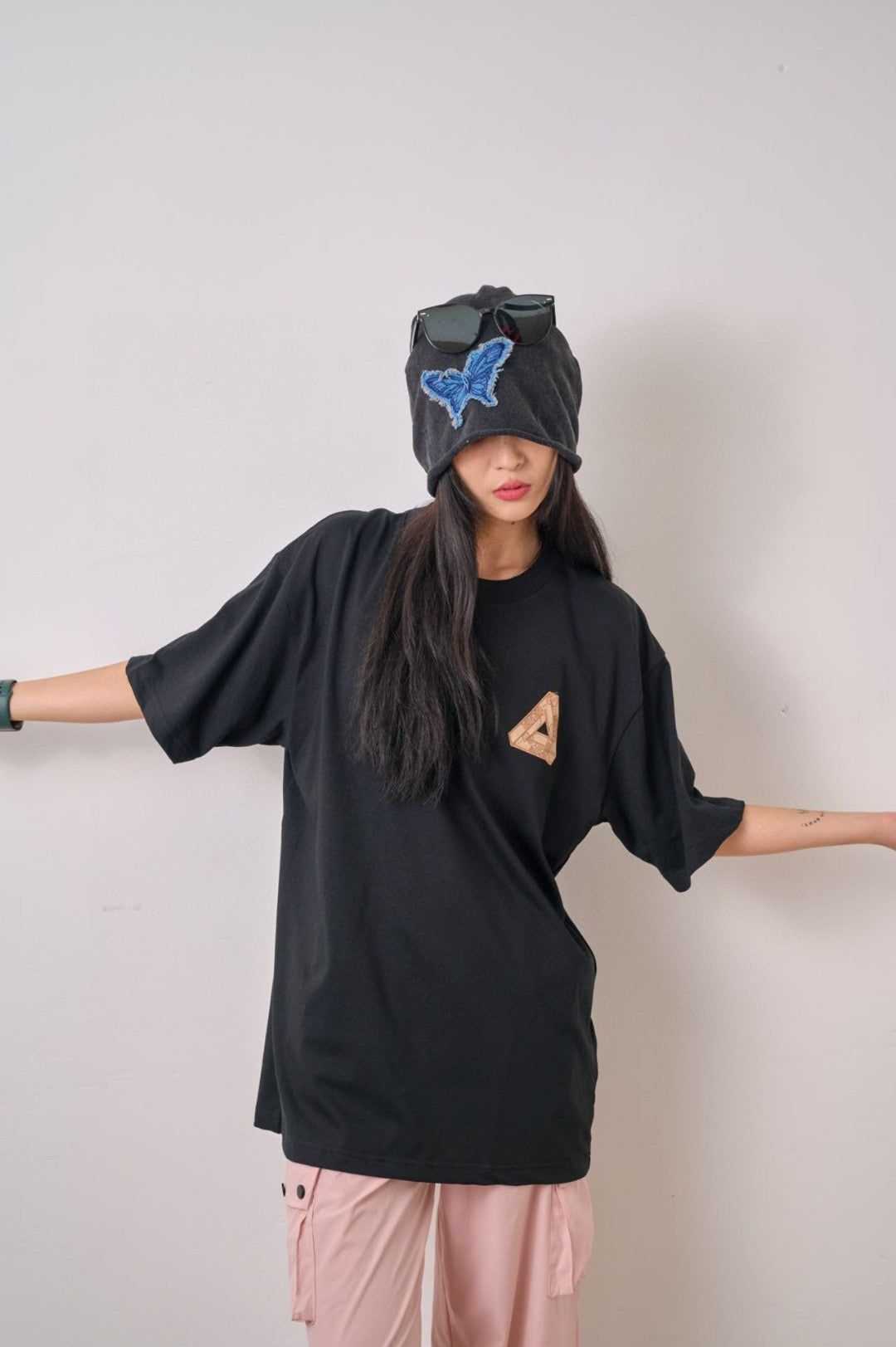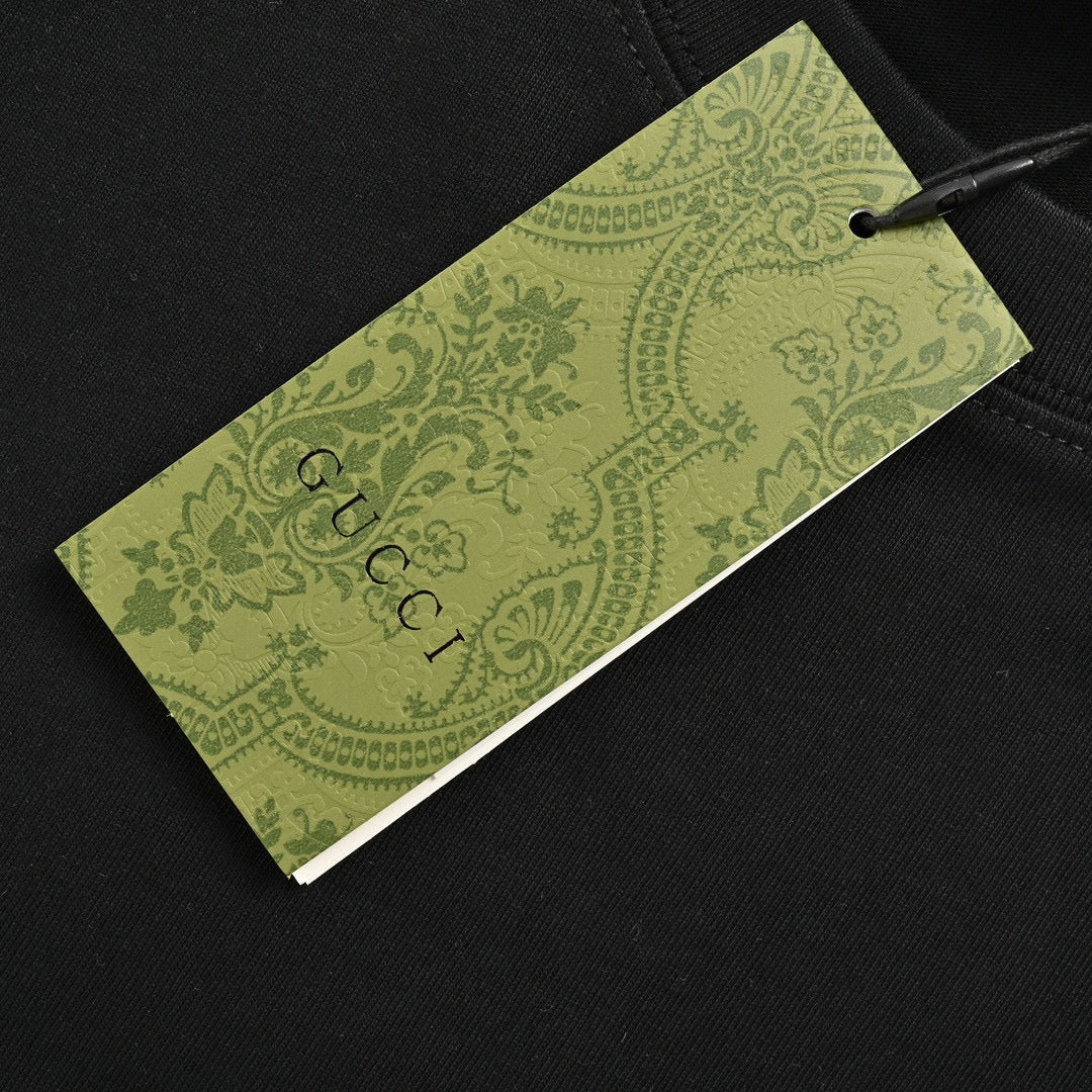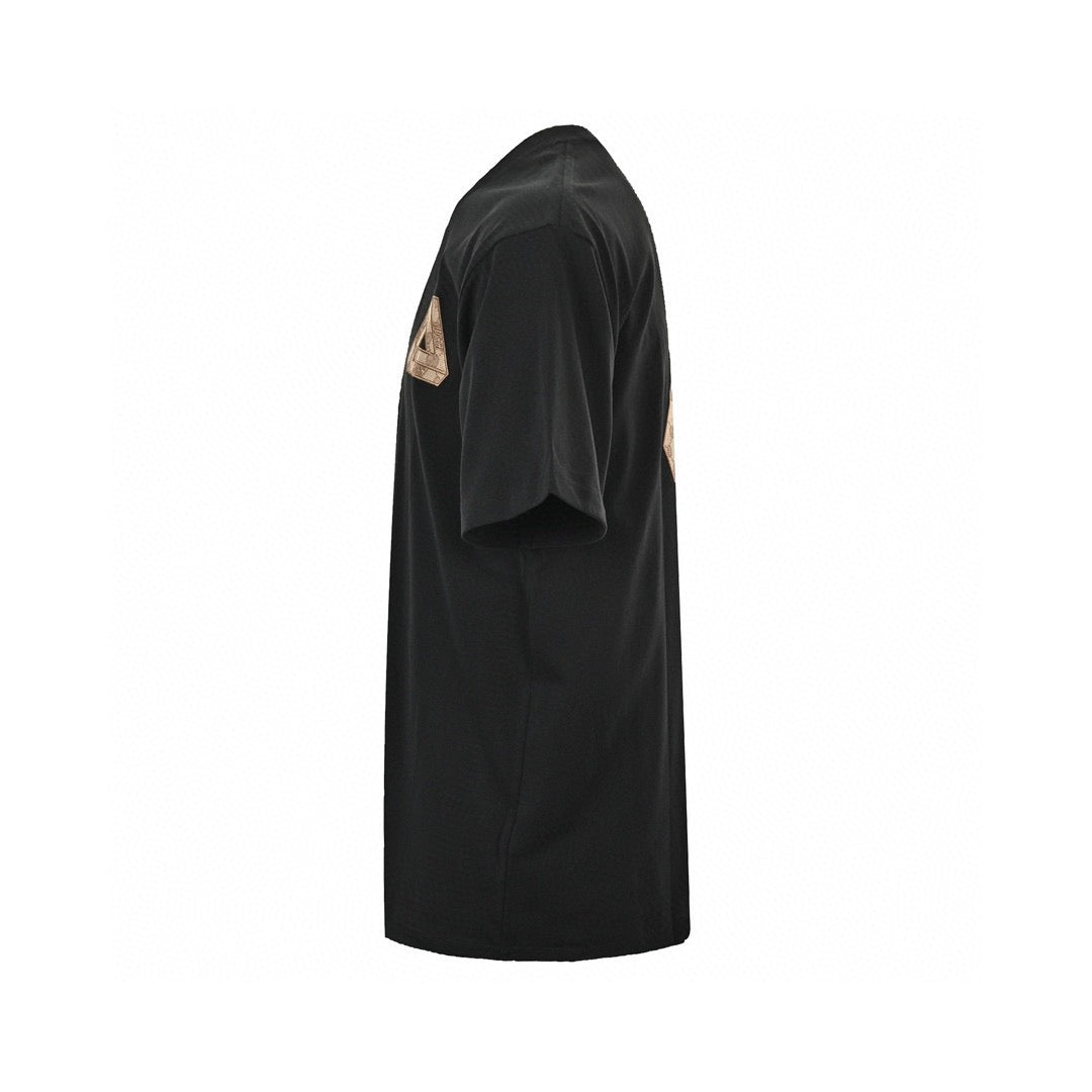 Ce t-shirt Gucci arbore un discret logo triangulaire sur la poitrine. Majoritairement noir, il offre une coupe décontractée, des manches courtes et un col montant. Idéal pour apporter une touche de luxe discret à votre garde-robe casual tout en privilégiant le confort.