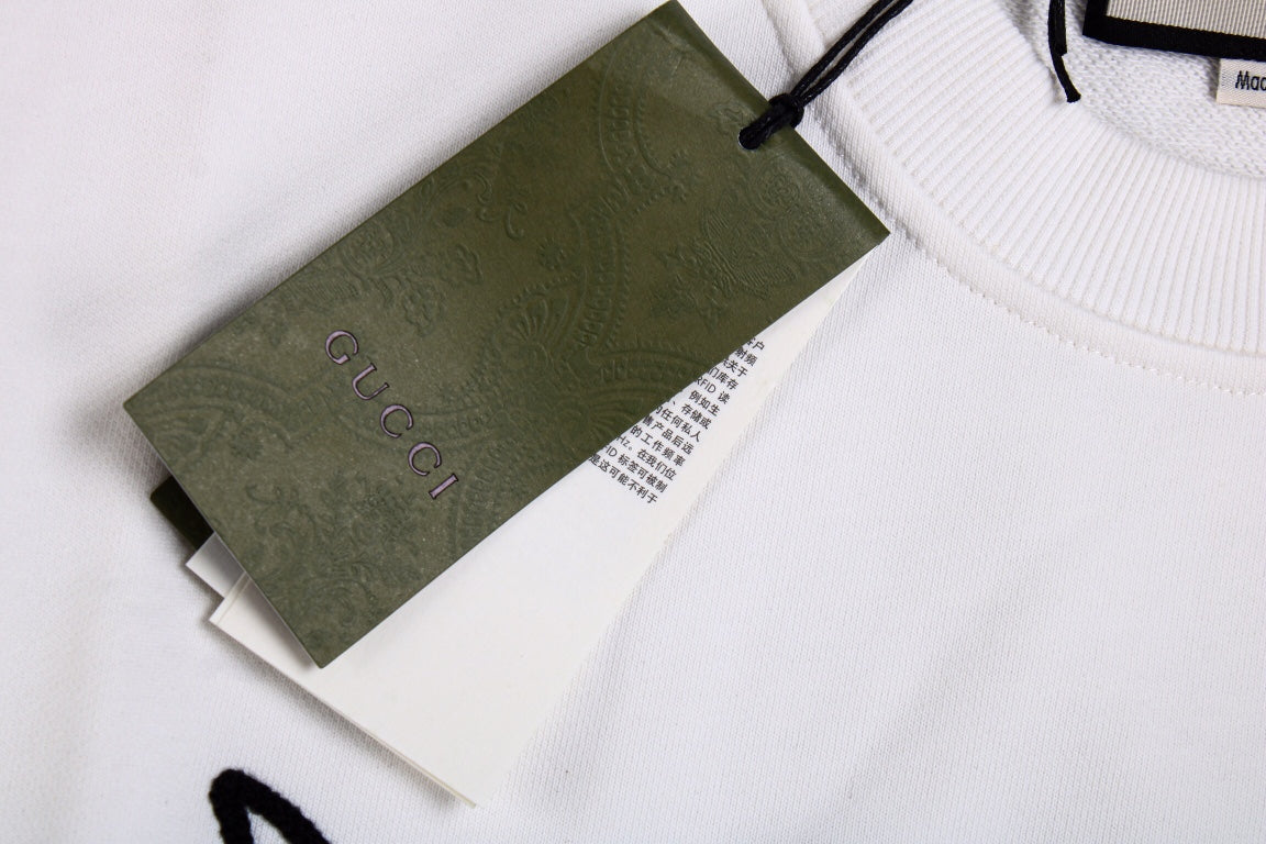 Sweat-shirt blanc orné d'un motif graphique audacieux. L'inscription « BALENCIAGA » en caractères gothiques noirs est surmontée de « GUCCI » en lettres colorées. Coupe confortable avec poignets et ourlet côtelés. Idéal pour un look à la fois stylé et décontracté.