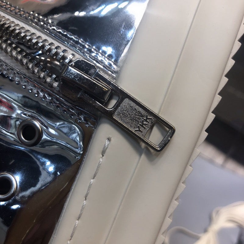 Ces baskets arborent une empeigne en cuir métallisé brillant qui leur confère une esthétique futuriste et captivante. La surface brillante et réfléchissante est mise en valeur par des lacets blancs, un embout et une semelle en caoutchouc blanc, créant un contraste dynamique qui sublime l'ensemble. Le cuir de haute qualité garantit durabilité et confort luxueux, tandis que la tige montante offre un maintien optimal de la cheville.