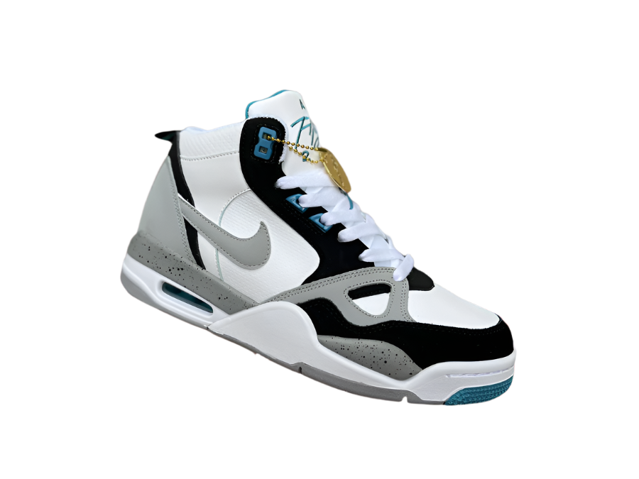 La basket présentée sur l'image est la Nike Air Flight 89 « Blanc/Gris froid/Aigue-marine », une chaussure de basketball rétro qui allie des éléments de design classiques à un coloris inédit. L'Air Flight 89 est réputée pour son côté nostalgique, car elle ressemble beaucoup à l'emblématique Air Jordan 4, dont elle partage la même semelle intermédiaire et la même semelle extérieure.