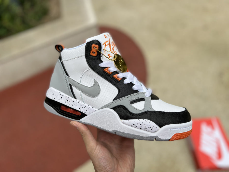 La basket présentée sur l'image est la Nike Air Flight 89, arborant un coloris éclatant blanc, noir, gris et orange. Cette chaussure de basketball rétro rend hommage aux modèles classiques de la fin des années 80 et du début des années 90, capturant l'essence de cette époque tout en y intégrant des détails modernes.