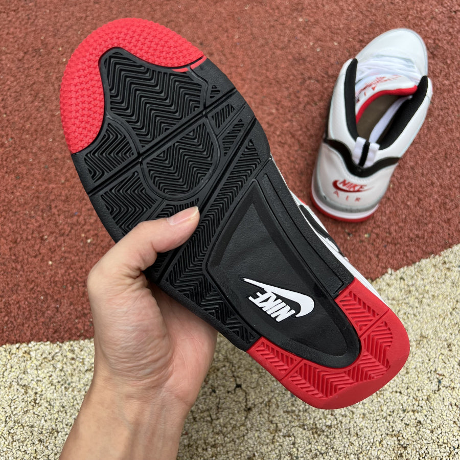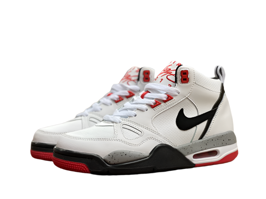L'empeigne est confectionnée en cuir blanc immaculé, offrant une base épurée et polyvalente, à la fois audacieuse et discrète. Les empiècements en daim gris ajoutent une touche de texture et de contraste, sublimant l'allure générale de la chaussure. Le point fort de ce modèle réside dans ses accents de rouge vif, mis en valeur sur le logo Jumpman, la semelle extérieure et la doublure intérieure, apportant une touche de couleur dynamique qui dynamise ce design classique.