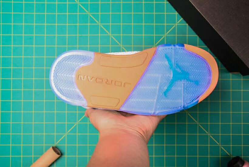 L'un des éléments les plus marquants de la Air Jordan 5 « South Beach » est sa semelle extérieure bleue translucide, qui non seulement sublime l'esthétique de la chaussure, mais offre également une adhérence et une durabilité exceptionnelles. Les détails emblématiques en forme de dents de requin sur la semelle intermédiaire sont rehaussés d'orange, créant un contraste saisissant avec le bleu turquoise et harmonisant l'ensemble du design.