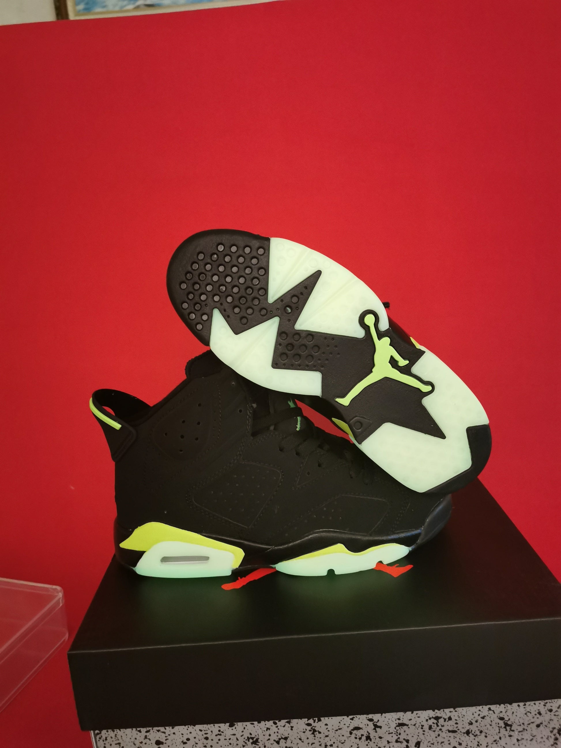 La Air Jordan 6 présentée ici arbore un design audacieux et saisissant qui ne manquera pas d'attirer les regards. Majoritairement noire, elle offre une base sobre et élégante qui contraste de façon spectaculaire avec les touches de vert fluo. Ce coloris, qui rappelle le classique « Electric Green », apporte une note vibrante à la chaussure, notamment au niveau de la semelle intermédiaire, de la languette au talon et du logo Jumpman sur la languette et la semelle extérieure.