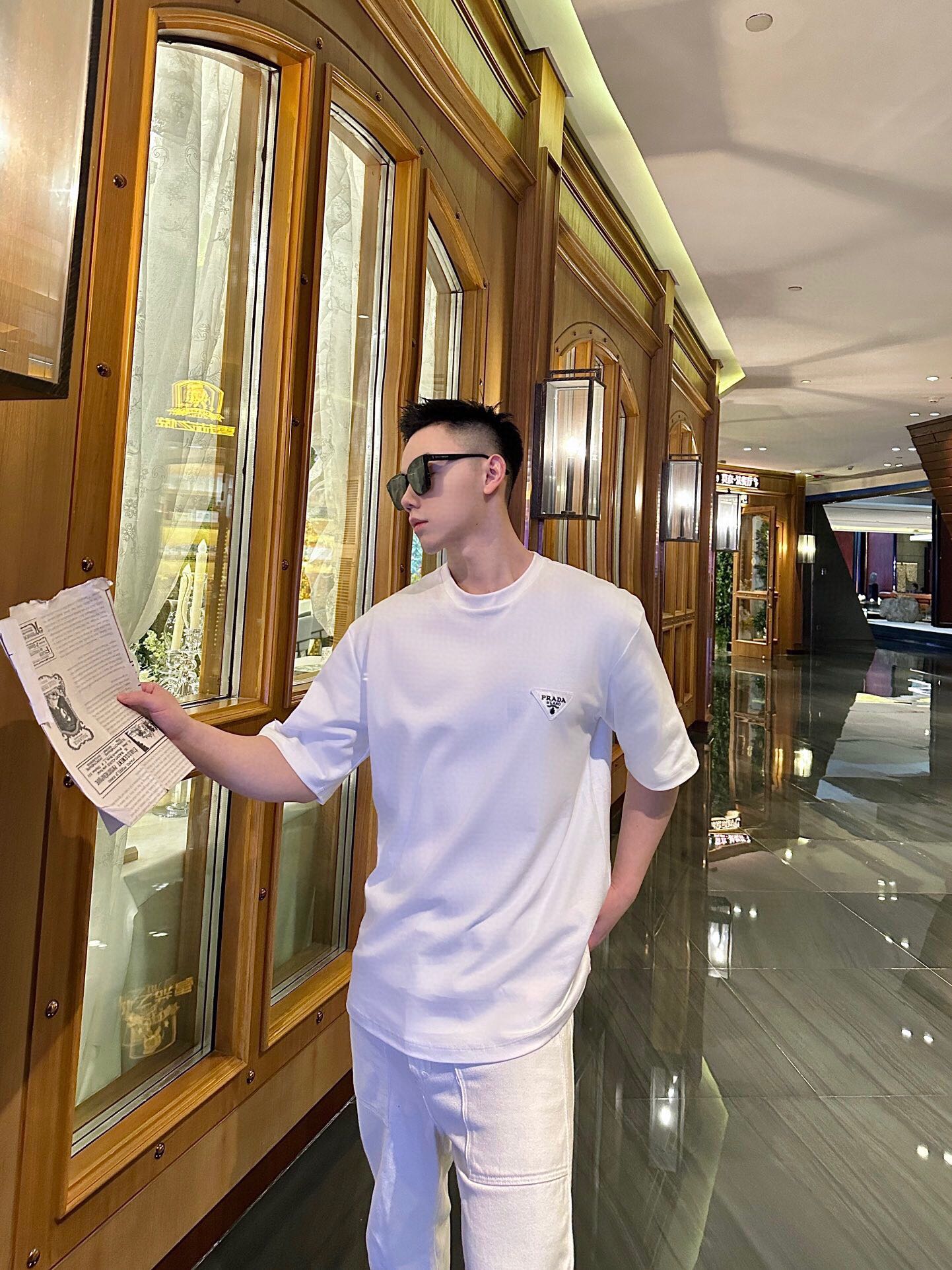 T-shirt blanc classique orné d'un discret logo Prada sur la poitrine. Confectionné en coton de qualité supérieure, ce t-shirt offre un style épuré et minimaliste. Idéal au quotidien, il s'accorde facilement avec toutes vos tenues.