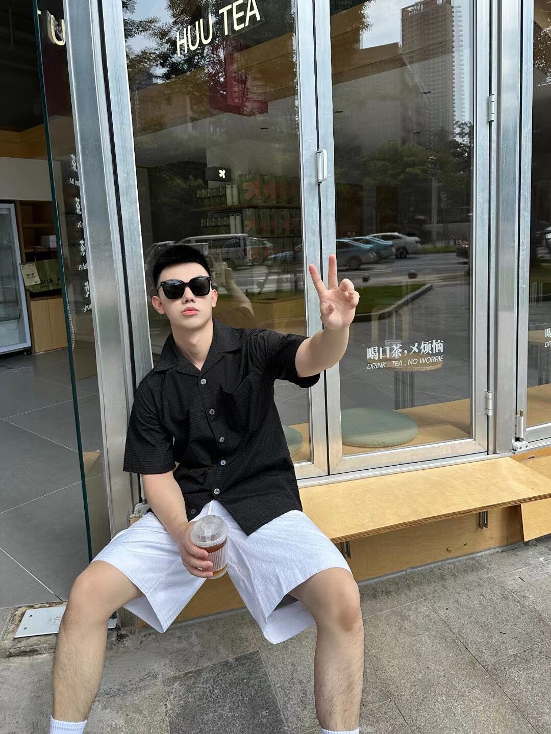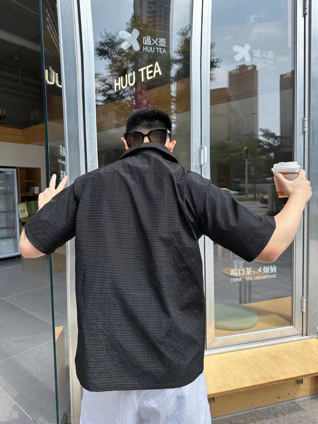 Chemise noire à manches courtes boutonnée, ornée d'un discret motif à carreaux. Poche poitrine et col classique. Un style épuré et minimaliste.