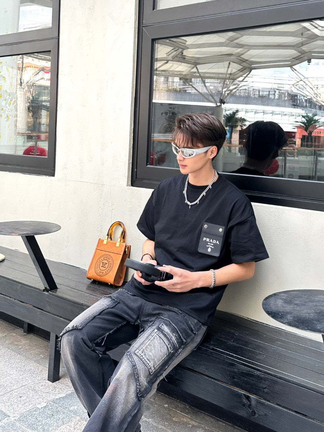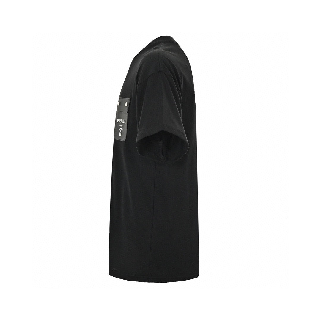 Ce t-shirt Prada arbore un design minimaliste rehaussé d'une poche distinctive sur le devant. Son tissu noir lui confère une allure élégante et moderne, tandis que la petite poche, ornée du logo Prada et de l'inscription « Milano », apporte une touche de raffinement et de fonctionnalité. Idéal pour celles et ceux qui apprécient le luxe discret dans leur garde-robe décontractée.