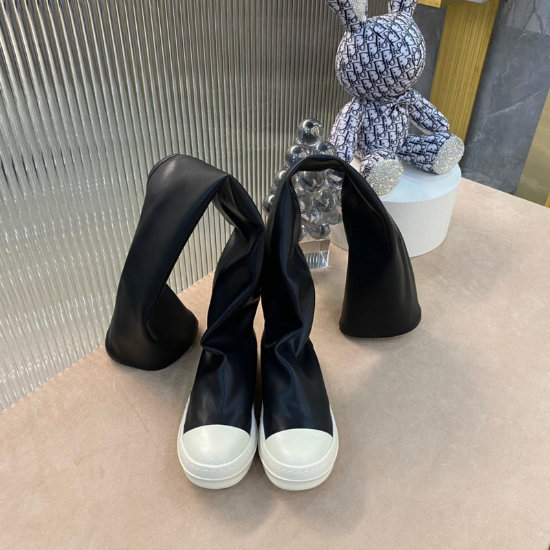 Ces baskets montantes avant-gardistes sont confectionnées dans une matière noire stretch de haute qualité qui épouse les jambes pour une silhouette élégante et fluide. La tige remonte bien au-dessus du genou, créant un profil élancé et saisissant. Le design est rehaussé par un bout et une semelle en caoutchouc blanc, apportant une touche de contraste classique à cette esthétique moderne.