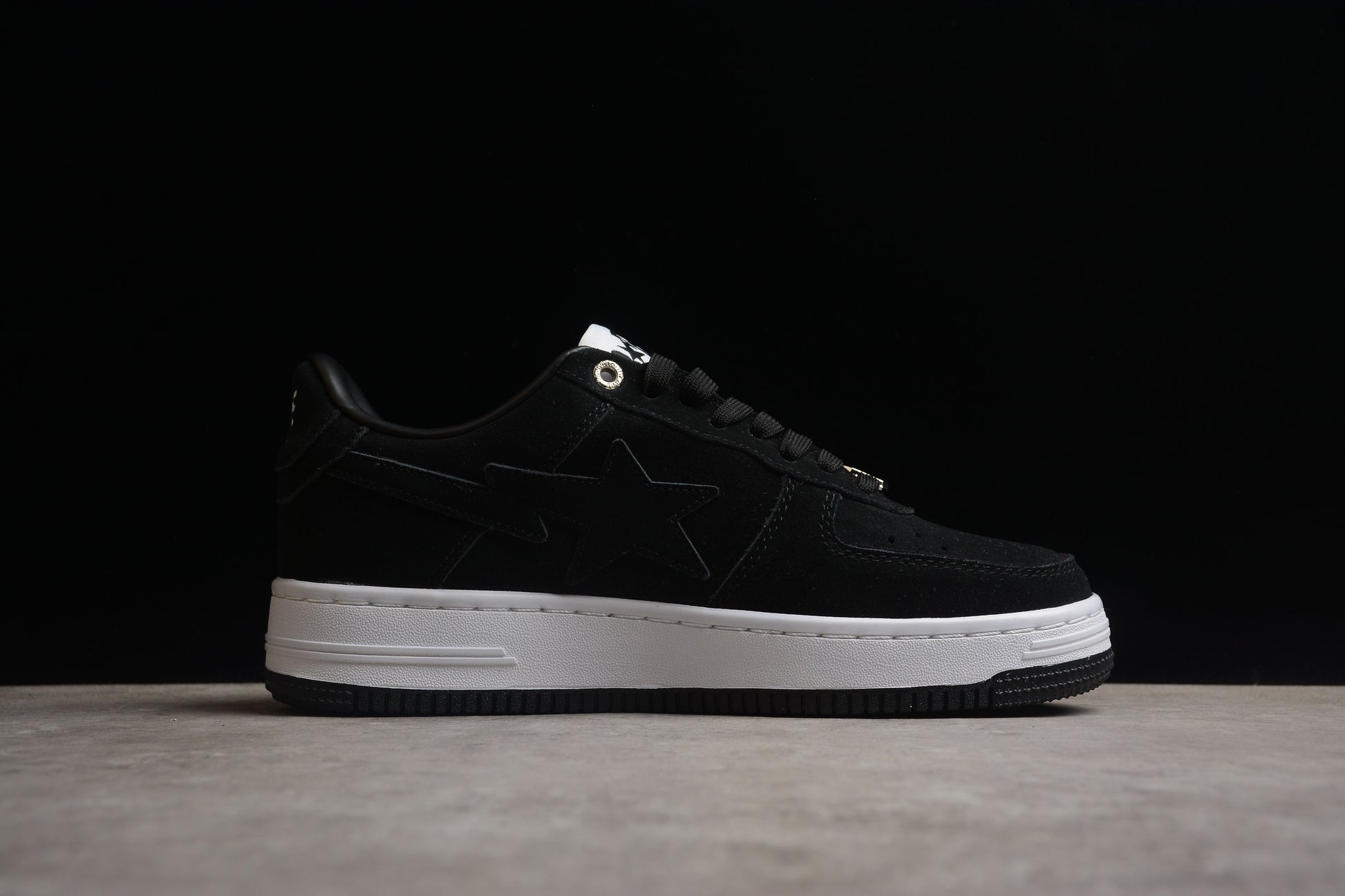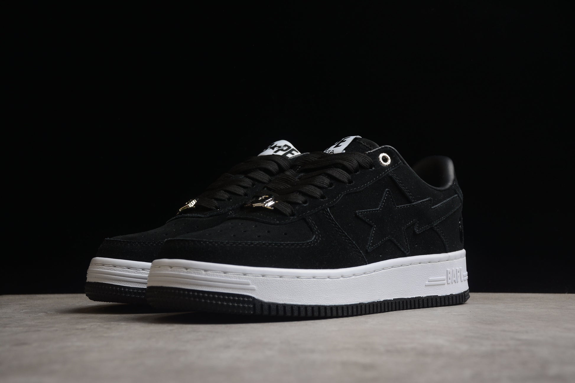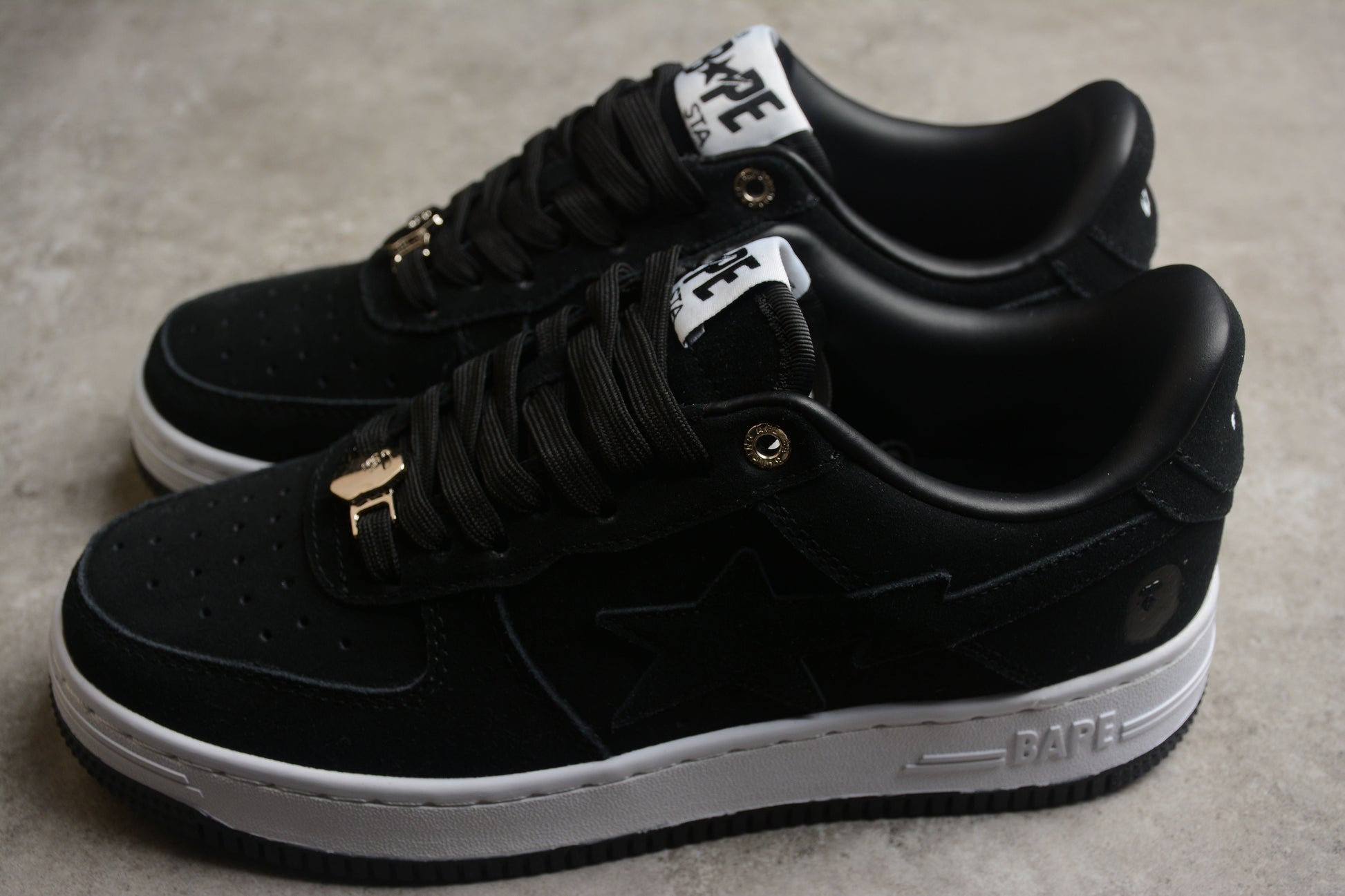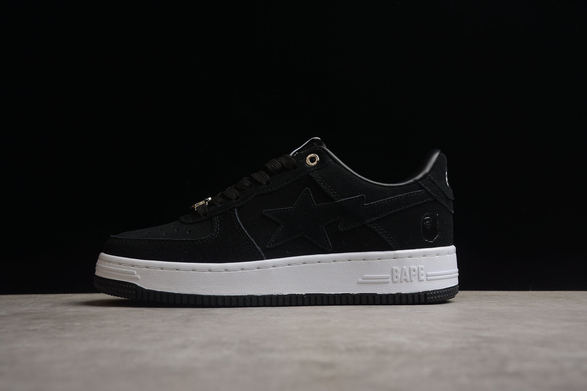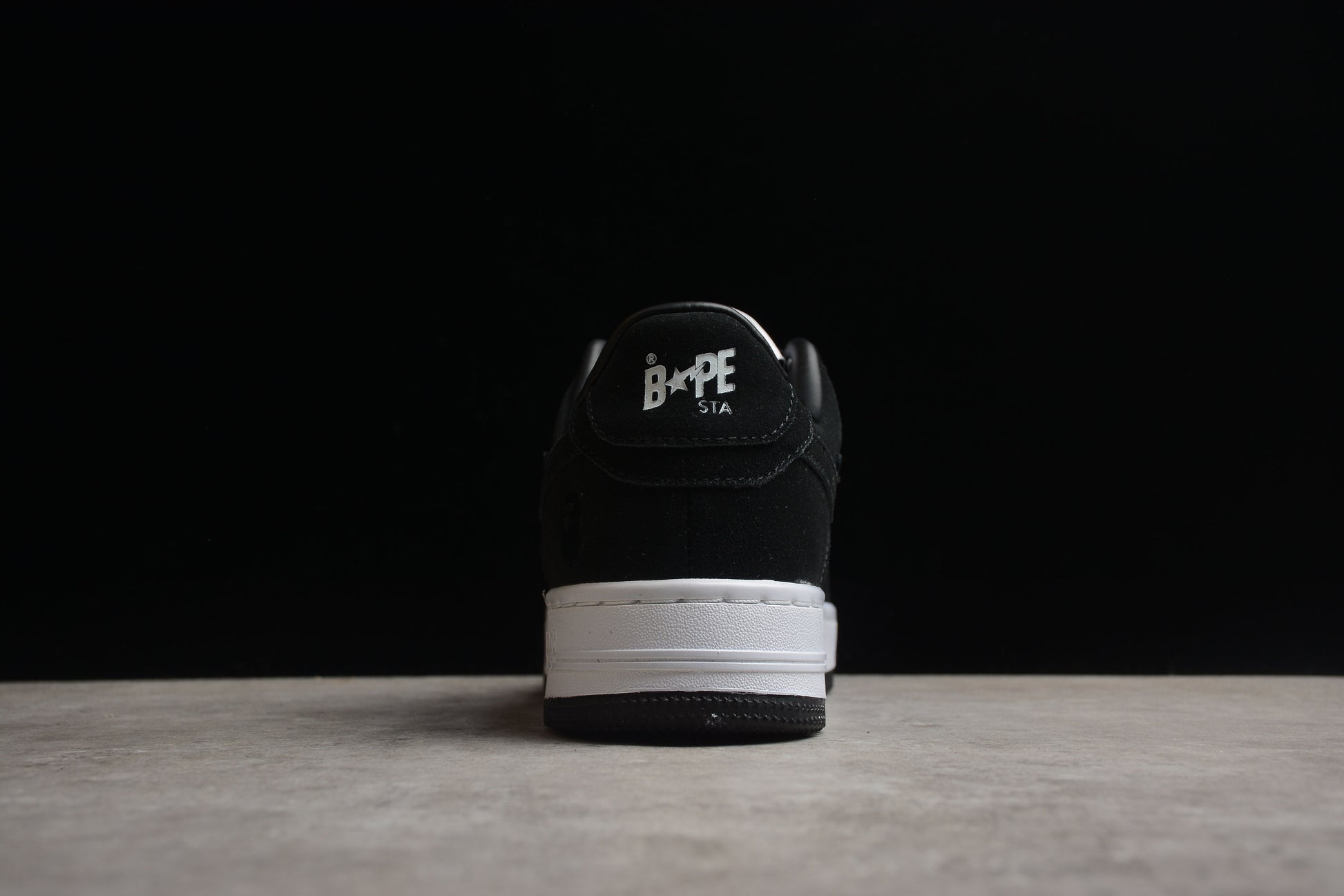 Ces sneakers arborent une élégante empeigne en daim noir, offrant une texture riche et un style raffiné. Le logo iconique BAPE STA est subtilement embossé sur les côtés, affirmant l'identité distinctive de la marque. Le coloris noir contraste avec une semelle intermédiaire blanche immaculée, apportant une touche classique à ce design moderne. Le daim de qualité supérieure sublime non seulement l'esthétique, mais garantit également durabilité et confort.